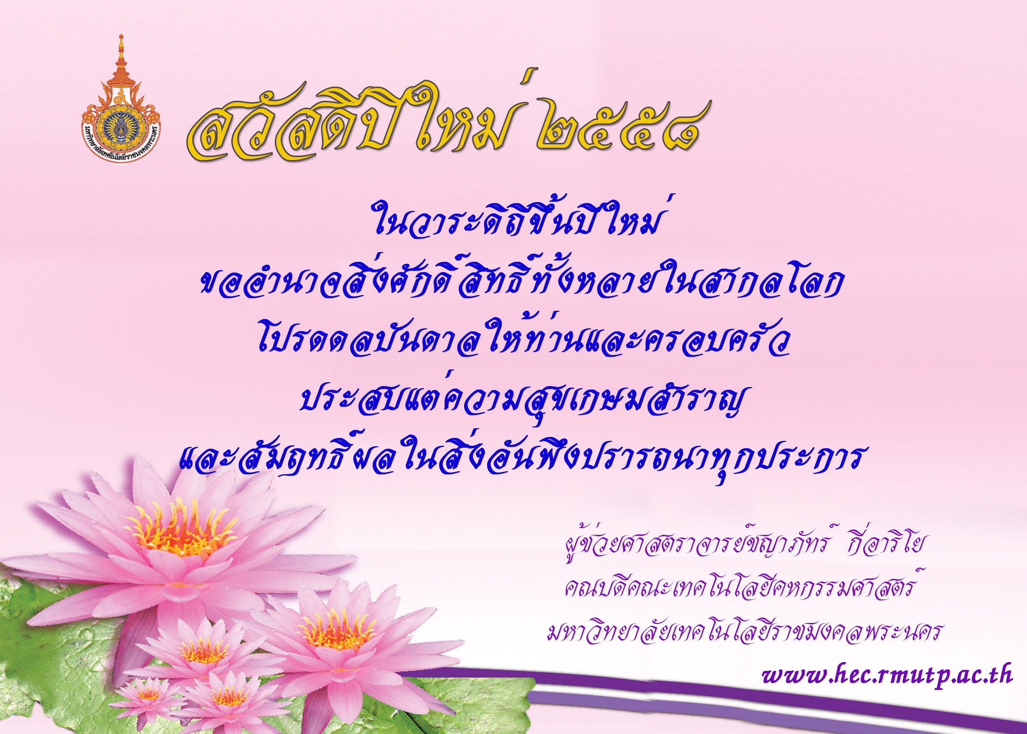 กิจกรรม สวัสดีปีใหม่ 2558 Posted 29/12/201429/12/2014 information ถึงบุคลากร คณะเทคโนโลยีคหกรรมศาสตร์ ทุกท่าน