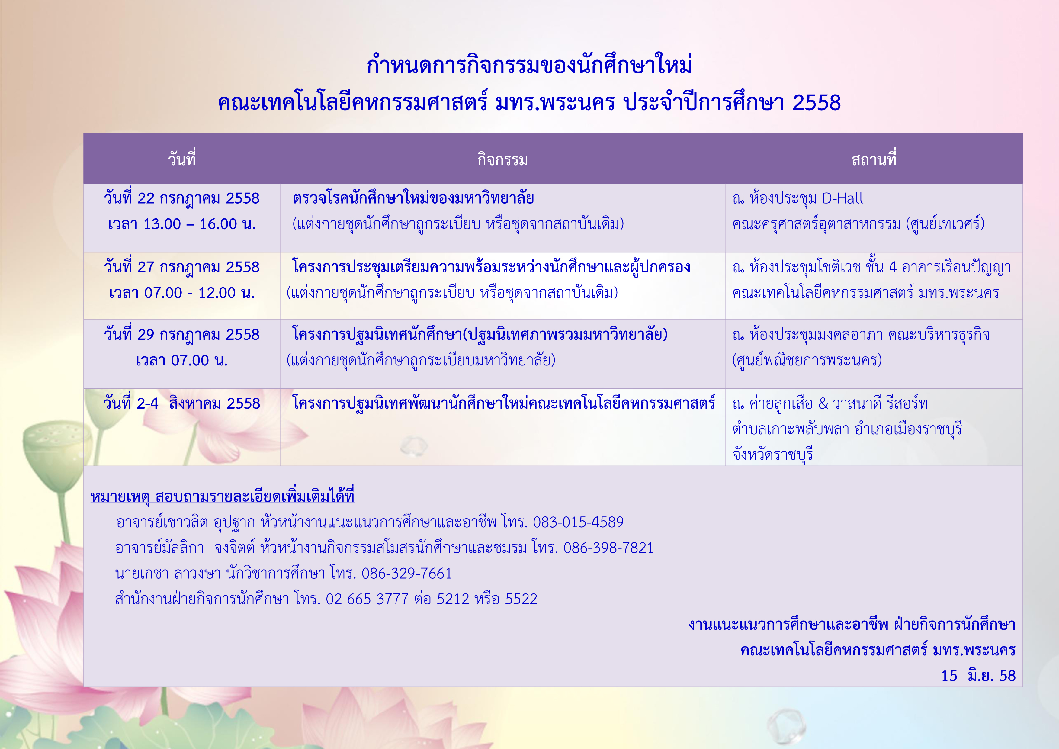 ข่าวประกาศ กำหนดการกิจกรรมของนักศึกษาใหม่ คณะเทคโนโลยีคหกรรมศาสตร์ มทร.พระนคร ประจำปีการศึกษา 2558 Posted 17/06/201517/06/2015 information กำหนดกิจกรรมของนักศึกษาใหม่คณะเทคตโนโลยีคหกรรมศาสตร์ 2558