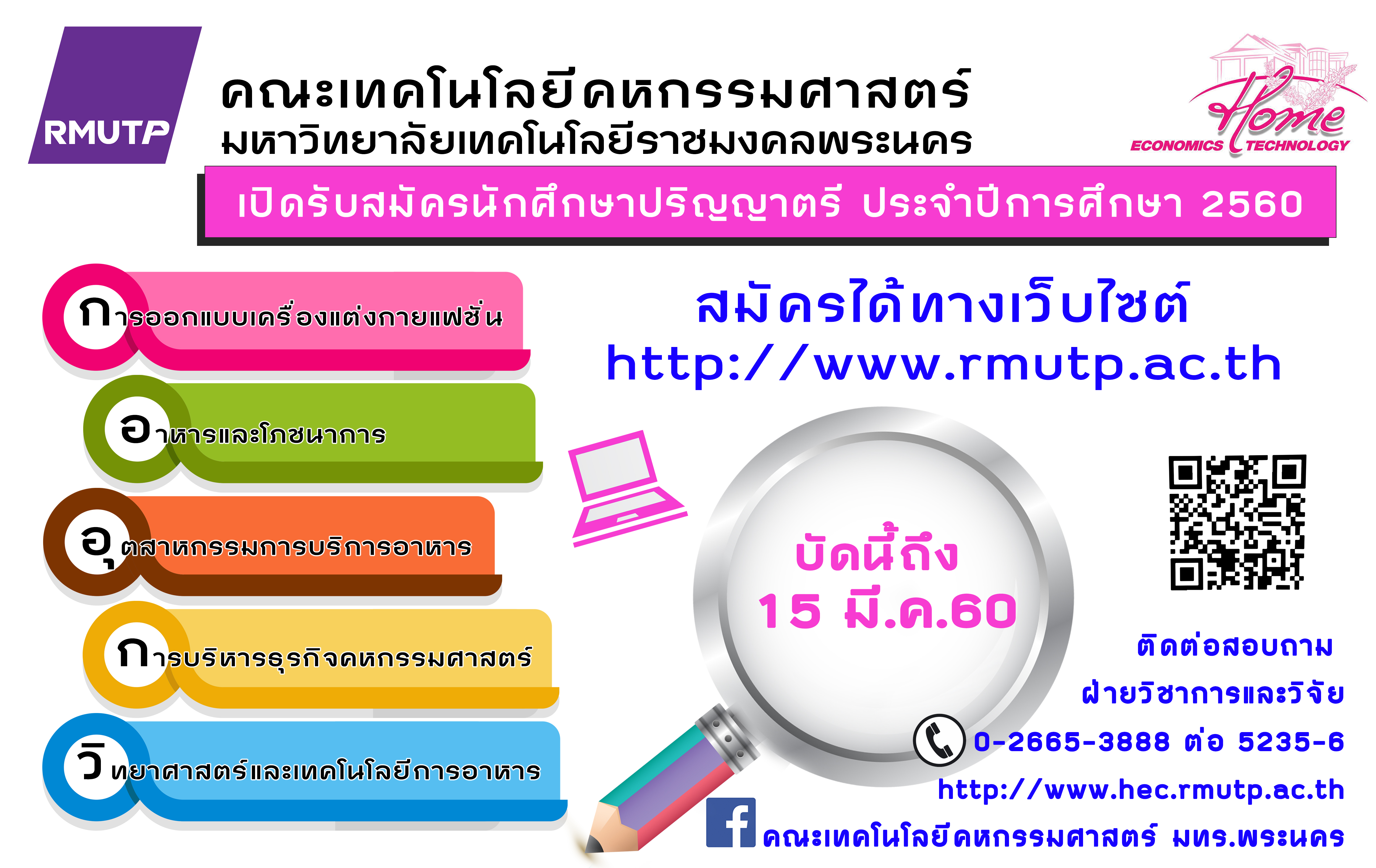 สมัครผ่านเว็บไซต์ ได้ที่ http://reg.rmutp.ac.th/registrar/apphome.asp กดปุ่มลงทะเบียนเข้าใช้ระบบ ตั้งแต่บัดนี้ ถึง 15 มีนาคม 2560