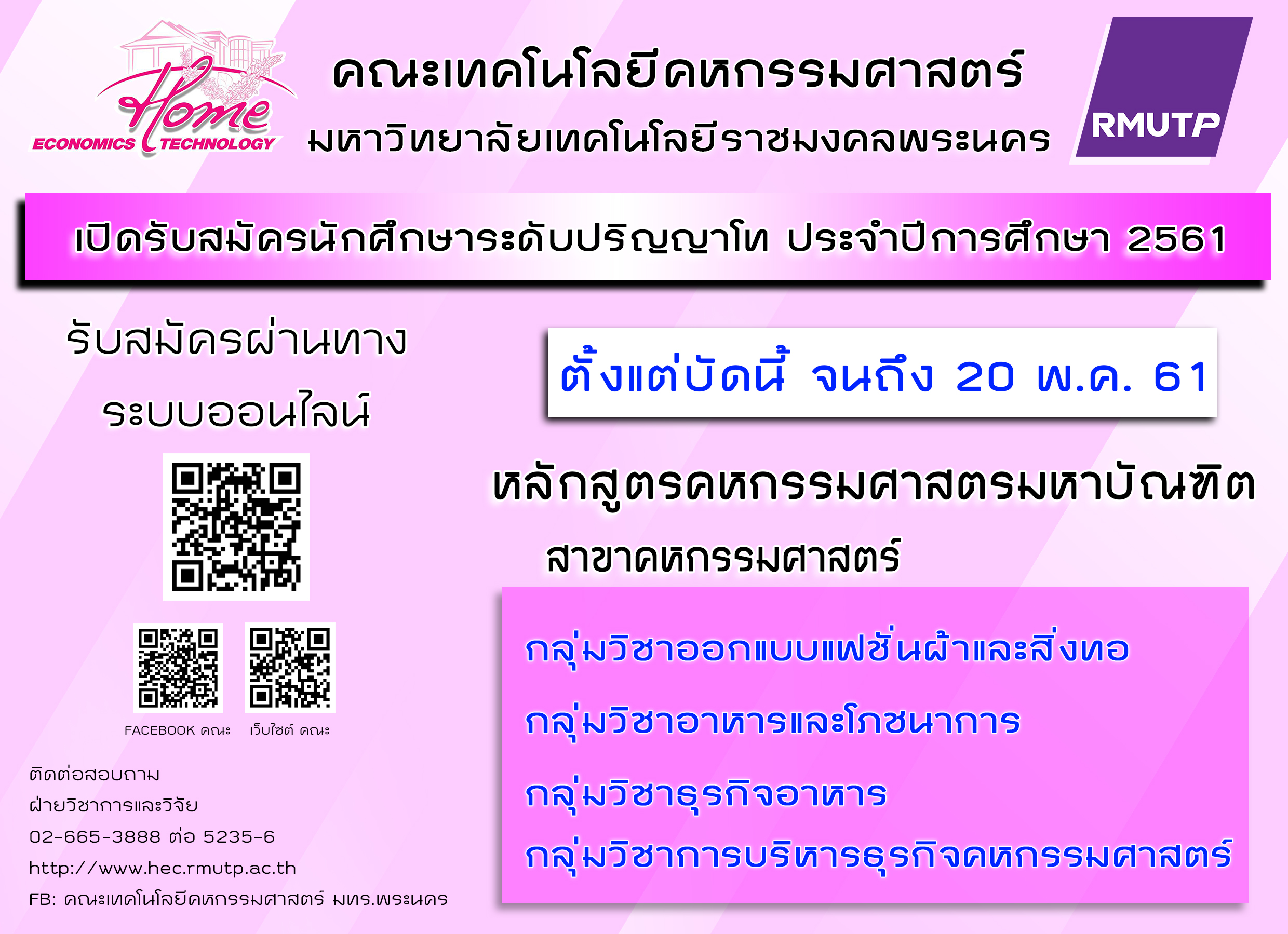 คณะเทคโนโลยีคหกรรมศาสตร์ มทร.พระนคร เปิดรับสมัคร ป.โท คหกรรมศาสตร์ ประจำปีการศึกษา 2561