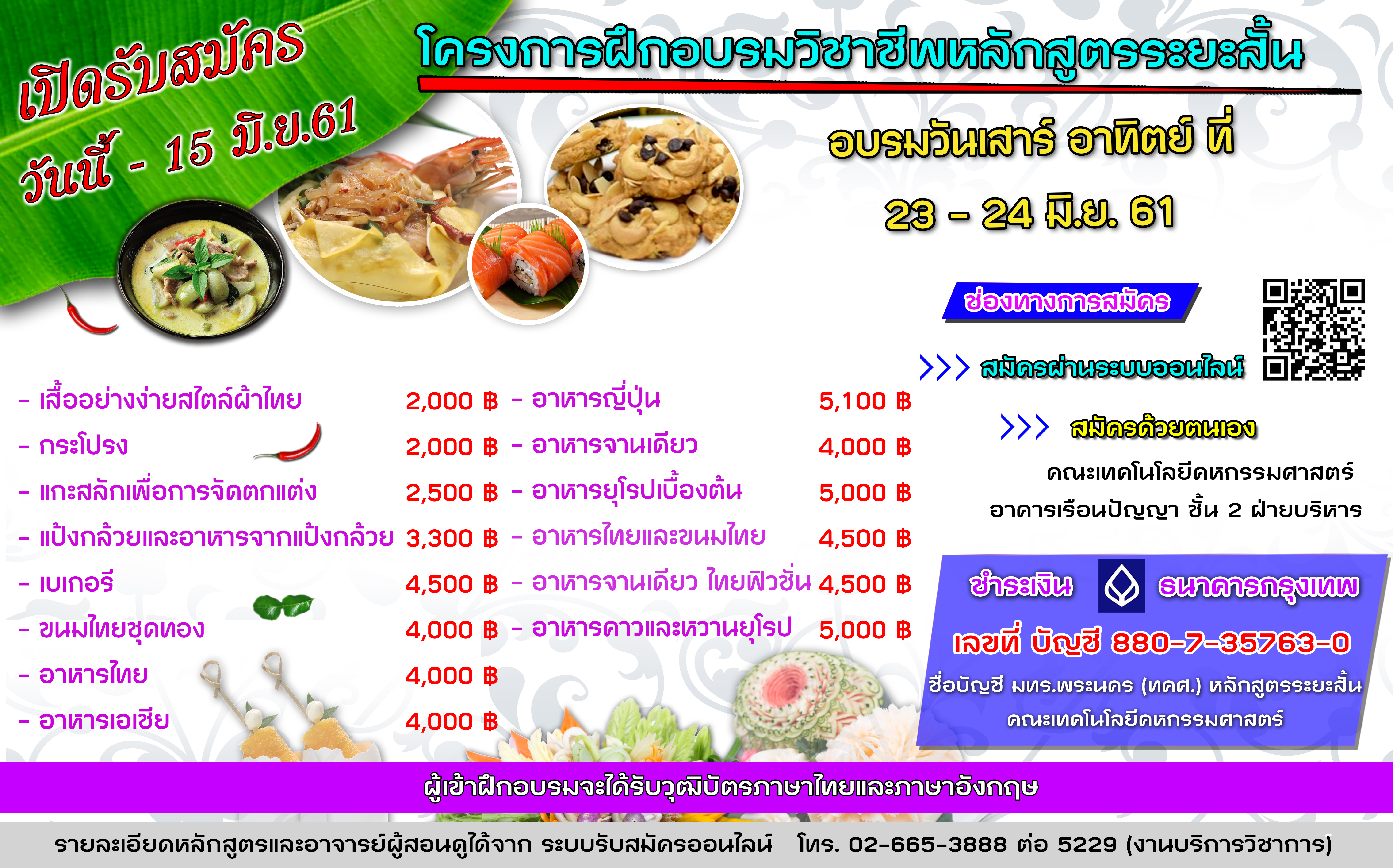 ข่าวประกาศ อบรมวิชาชีพหลักสูตรระยะสั้น Posted 15/06/201818/07/2018 information คณะเทคโนโลยีคหกรรมศาสตร์ ม.ราชมงคลพระนคร เปิดรับสมัครการอบรมวิชาชีพหลักสูตรระยะสั้น ด้านการทำอาหารไทย ขนมไทย อาหารนานาชาติ เบเกอรี่ การแกะสลักผักผลไม้ และอื่นๆมากกว่า 10 วิชา อ่านรายละเอียด