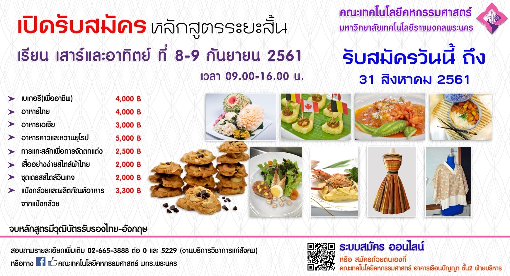 คณะเทคโนโลยีคหกรรมศาสตร์ (โชติเวช) ม.ราชมงคลพระนคร เปิดอบรมวิชาชีพหลักสูตรระยะสั้น สำหรับบุคคลทั่วไป ในหลักสูตรอาหารไทย เบเกอรี อาหารเอเชีย อาหารคาวหวานยุโรป การแกะสลักผักผลไม้ แป้งกล้วยและผลิตภัณฑ์อาหารจากแป้งกล้วย ตัดเย็บเสื้อผ้าและชุดเดรสสไตล์วินเทจ เป็นต้น รับสมัครถึงวันที่ 31 สิงหาคม 2561 เวลา 08.30-16.00 น. อบรมวันเสาร์-วันอาทิตย์ที่ 8-9 กันยายน เวลา 09.00-16.00 น.สอบถามรายละเอียดเพิ่มเติมได้ที่ งานบริการวิชาการแก่สังคม โทร 02-665-3888 ต่อ 0,5229 อ่านรายละเอียดเพิ่มเติม