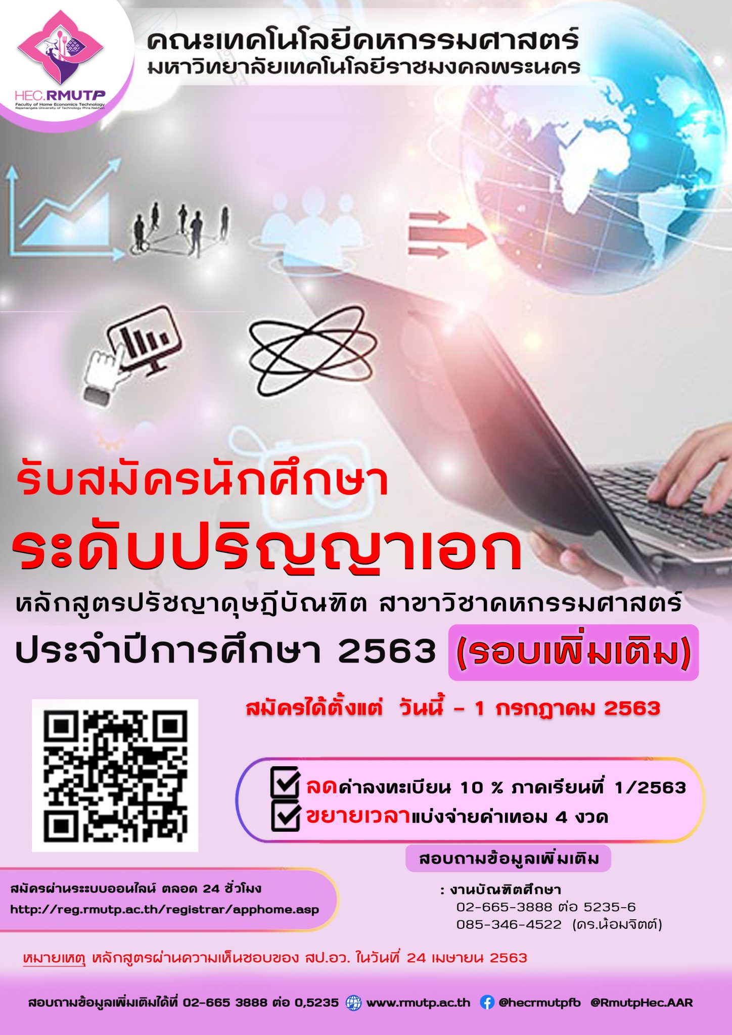 คณะเทคโนโลยีคหกรรมศาสตร์ มหาวิทยาลัยเทคโนโลยีราชมงคลพระนคร เปิดรับสมัครนักศึกษาระดับปริญญาเอก หลักสูตรปรัชญาดุษฎีบัณฑิต สาขาวิชาคหกรรมศาสตร์ (เพิ่มเติม)