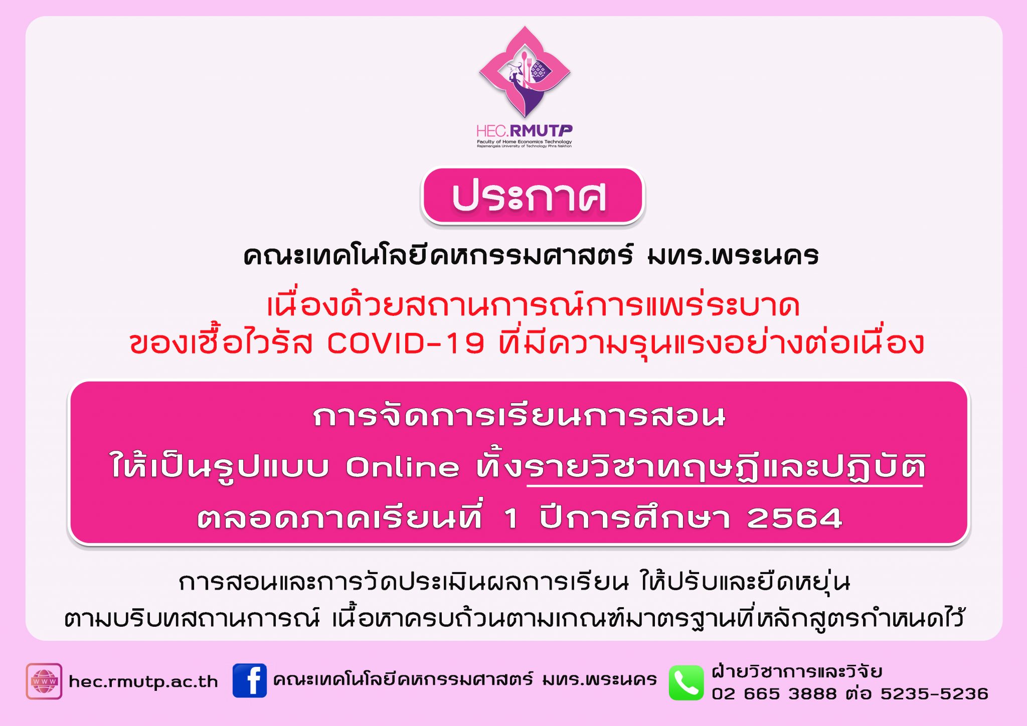 กิจกรรม การจัดการเรียนการสอน ภาคเรียนที่ 1 ปีการศึกษา 2564 Posted 23/07/202123/07/2021 information ประกาศ คณะเทคโนโลยีคหกรรมศาสตร์ มหาวิทยาลัยเทคโนโลยีราชมงคลพระนคร เรื่อง การจัดการเรียนการสอน ภาคเรียนที่ 1 ปีการศึกษา 2564
