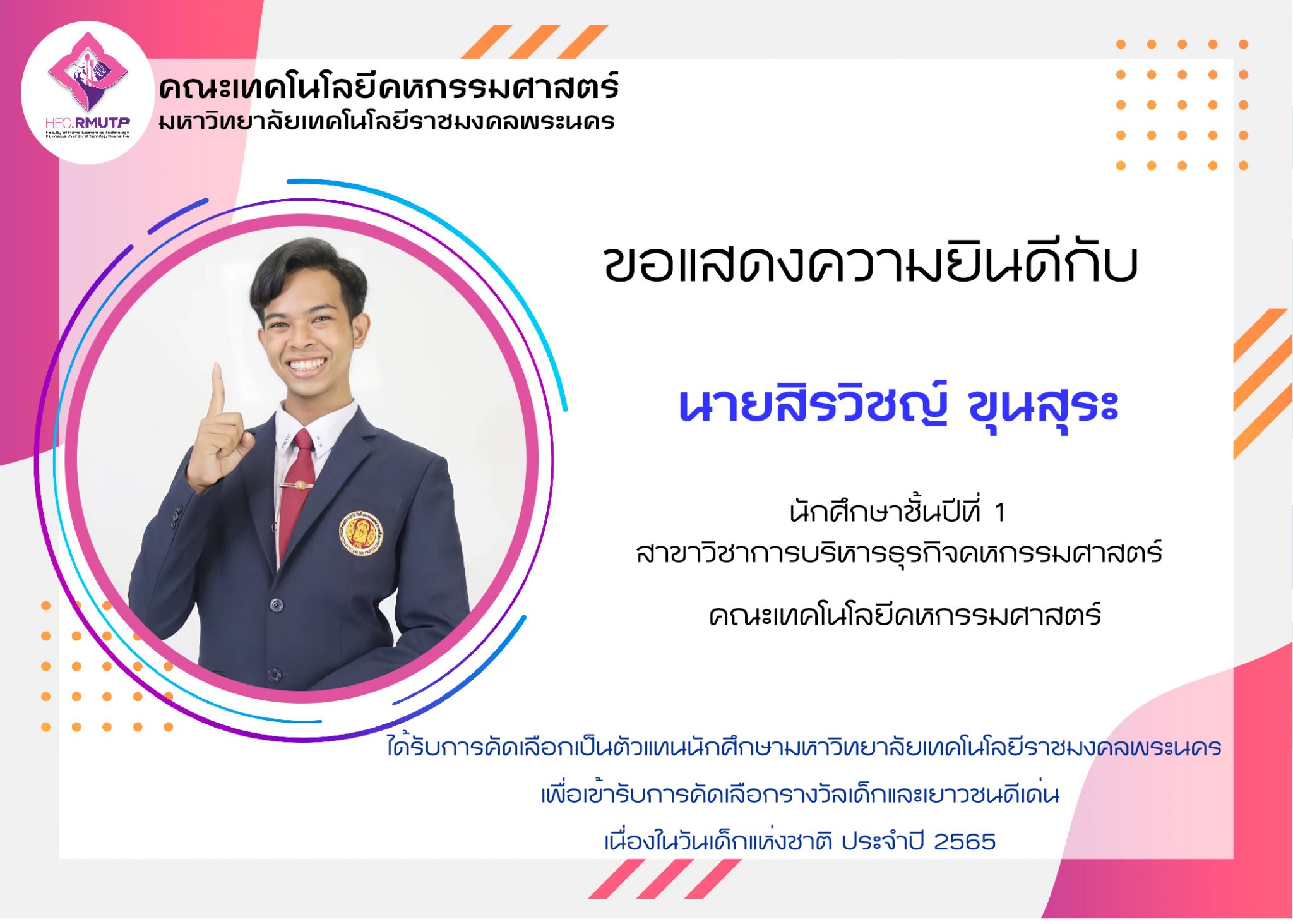 ขอแสดงความยินดีกับ นายสิรวิชญ์ ขุนสุระ นักศึกษาชั้นปีที่ 1 สาขาวิชาการบริหารธุรกิจคหกรรมศาสตร์ คณะเทคโนโลยีคหกรรมศาสตร์ ได้รับการคัดเลือกเป็นตัวแทนนักศึกษามหาวิทยาลัยเทคโนโลยีราชมงคลพระนครเพื่อเข้ารับการคัดเลือกรางวัลเด็กและเยาวชนดีเด่น เนื่องในวันเด็กแห่งชาติ ประจำปี 2565