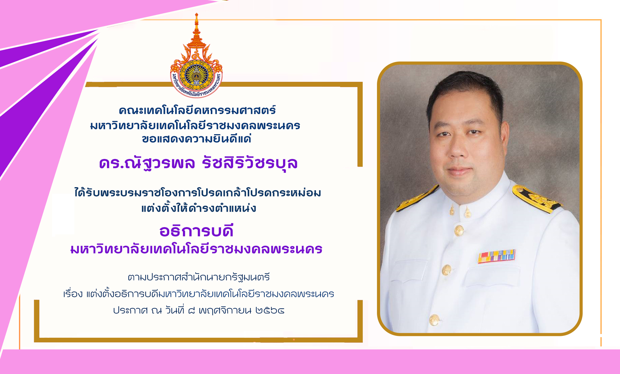คณะเทคโนโลยีคหกรรมศาสตร์ มหาวิทยาลัยเทคโนโลยีราชมงคลพระนคร ขอแสดงความยินดีแด่ ดร.ณัฐวรพล รัชสิริวัชรบุล ได้รับพระบรมราชโองการโปรดเกล้าโปรดกระหม่อม แต่งตั้งให้ดำรงตำแหน่งอธิการบดีมหาวิทยาลัยเทคโนโลยีราชมงคลพระนคร