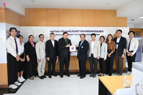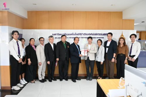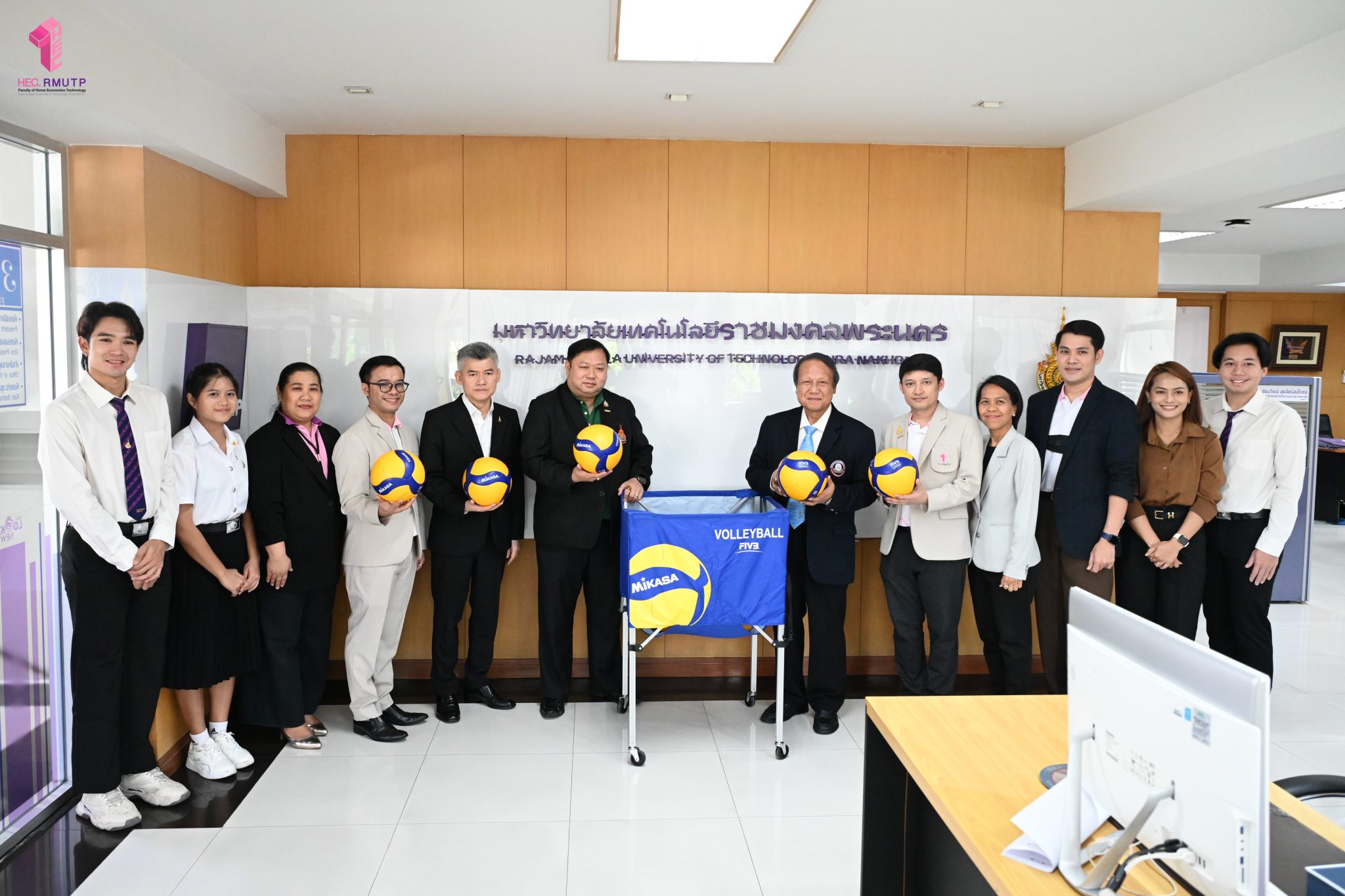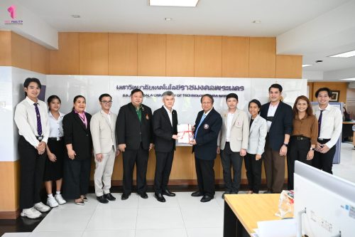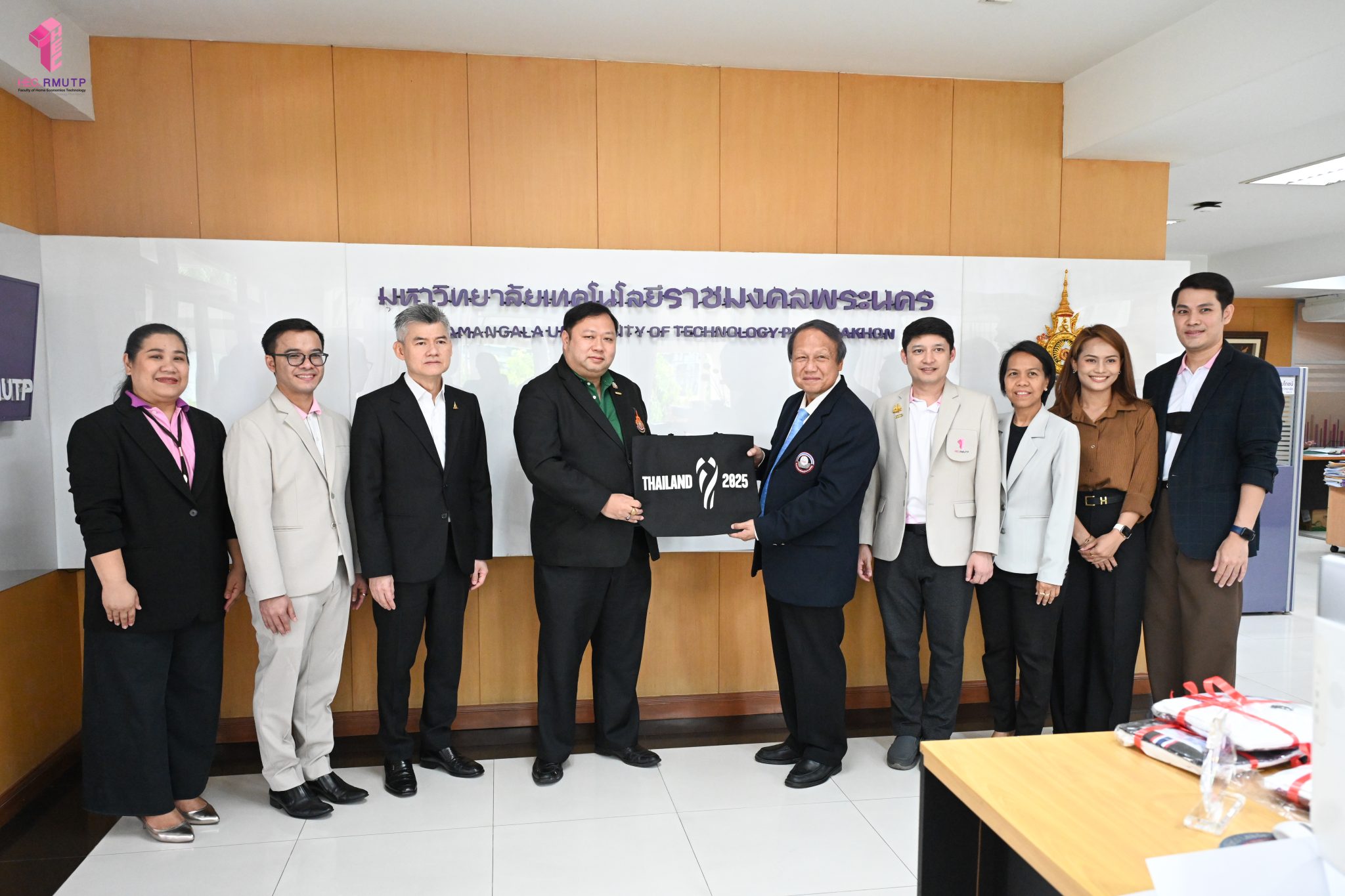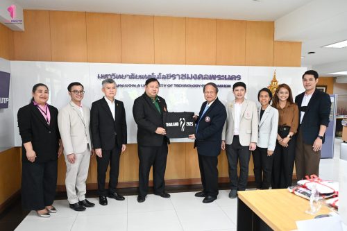 คุณสมพร ใช้บางยาง นายกสมาคมกีฬาวอลเลย์บอลแห่งประเทศไทย เข้าขอบคุณ มหาวิทยาลัยเทคโนโลยีราชมงคลพระนคร ที่ให้การสนับสนุนสมาคมกีฬาวอลเลย์บอลแห่งประเทศไทย ในการจัดการแข่งขัน FIVB Volleyball Women’s World Championship ที่ประเทศไทยเป็นเจ้าภาพ ในการนี้ ผู้ช่วยศาสตราจารย์ ดร.ธนภพ โสตรโยม คณบดีคณะเทคโนโลยีคหกรรมศาสตร์ พร้อมด้วย ผู้ช่วยศาสตราจารย์ ดร.เชาวลิต อุปฐาก รองคณบดีฝ่ายกิจการนักศึกษา อาจารย์ ดร.เกชา ลาวงษา ผู้ช่วยคณบดี ผู้ช่วยศาสตราจารย์ ดร.ประพาฬภรณ์ ธีรมงคล หัวหน้าสาขาวิชาออกแบบแฟชั่นและการจัดการสินค้า และนักศึกษาชมรมวอลเลย์บอล เข้ารับมอบของที่ระลึกจาก คุณสมพร ใช้บางยาง นายกสมาคมกีฬาวอลเลย์บอลแห่งประเทศไทย เมื่อวันที่ 1 ตุลาคม 2568 ณ ห้องอธิการบดี สำนักงานอธิการบดี มหาวิทยาลัยเทคโนโลยีราชมงคลพระนคร ศูนย์เทเวศร์