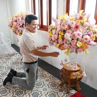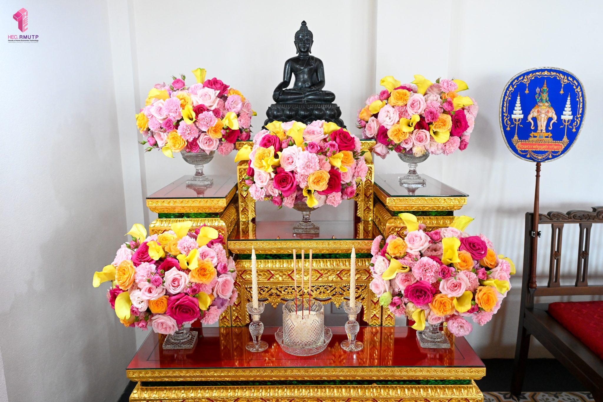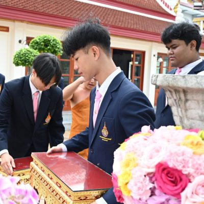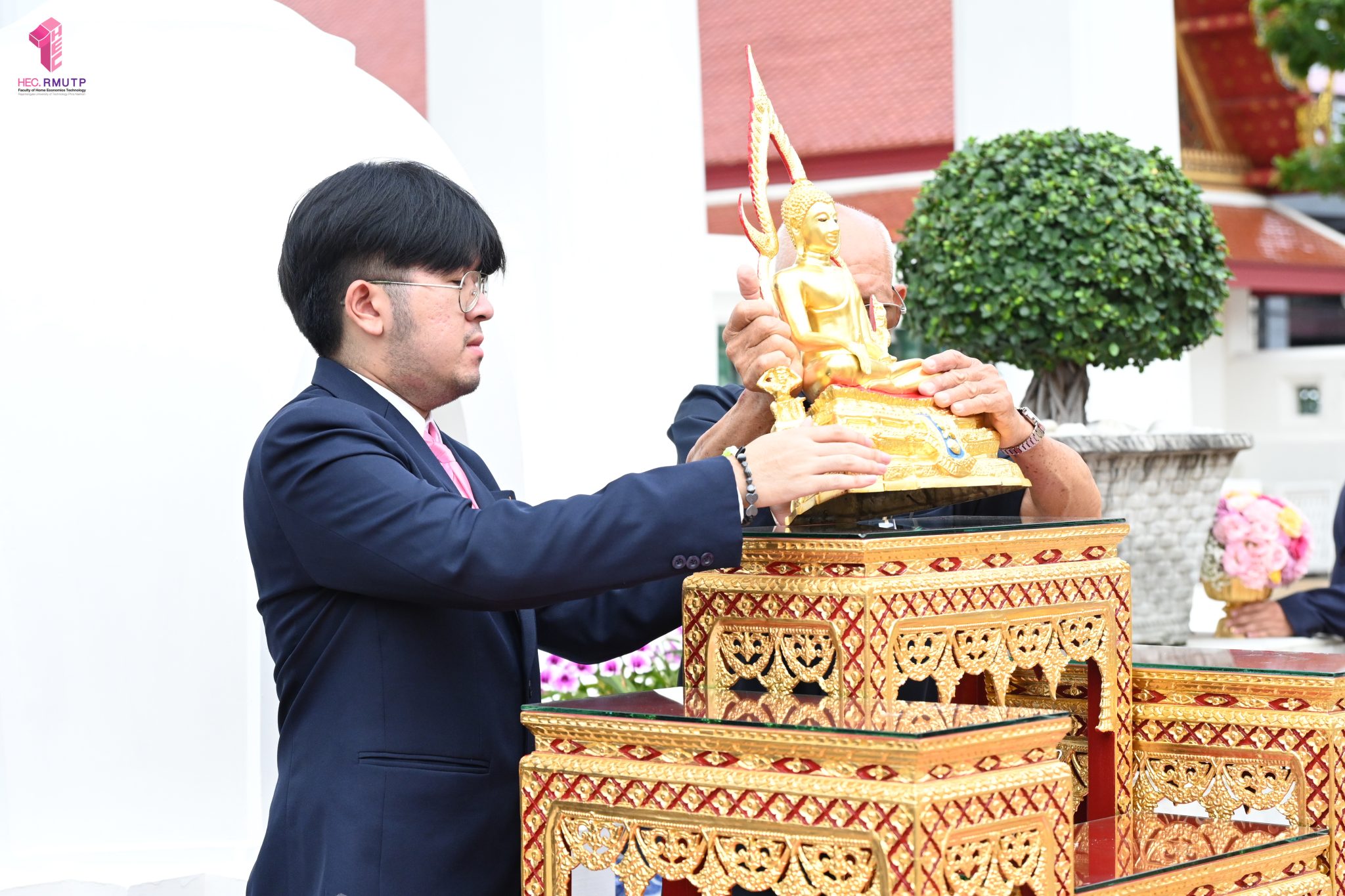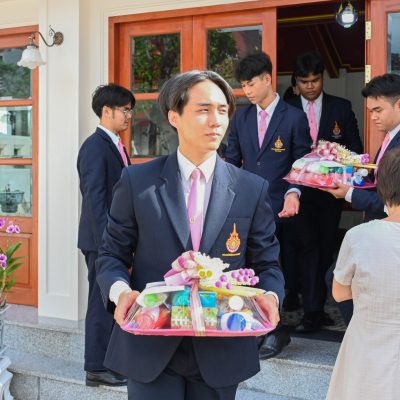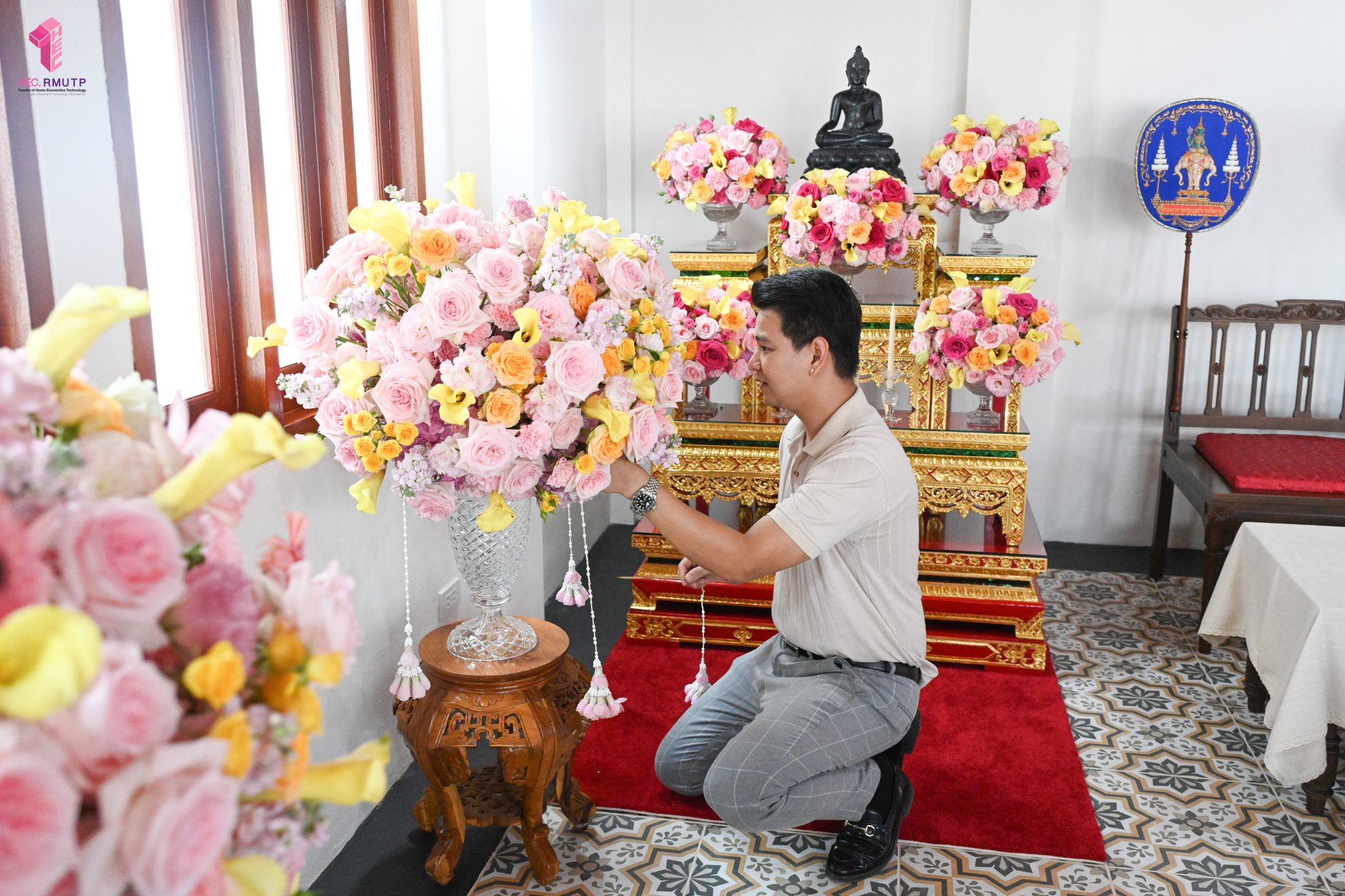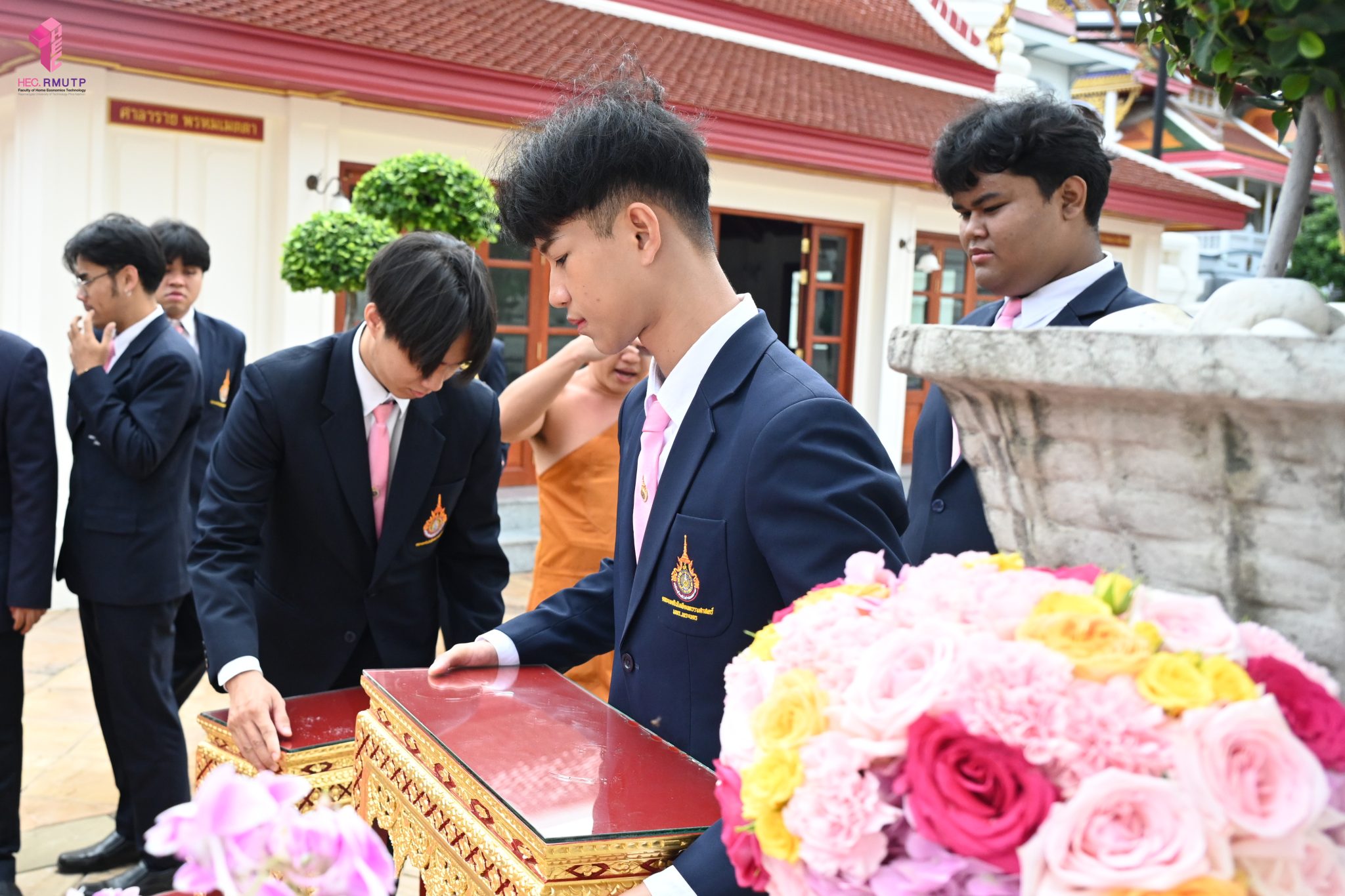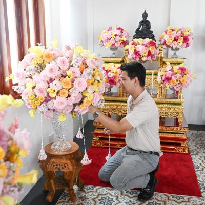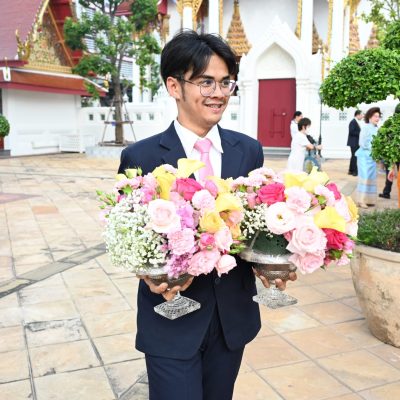 ผู้ช่วยศาสตราจารย์อนุสรณ์ ใจทน อาจารย์ประจำสาขาวิชาคหกรรมศาสตร์ประยุกต์ และอาจารย์ศุภสิทฐ์ วราศิลป์ หัวหน้างานศิลปวัฒนธรรม ฝ่ายกิจการนักศึกษา นำทีมนักศึกษาสโมสรนักศึกษาเข้าร่วมปฏิบัติงานในพิธีถวายเจริญพระพุทธมนต์เพื่อความเป็นสิริมงคล ในโอกาสที่ ดร.วรวิทย์ วีรบวรพงศ์ ดร.พัชรา วีรบวรพงศ์ พร้อมครอบครัว บริษัท สยามแก๊ส แอนด์ ปิโตรเคมีคัลส์ จำกัด (มหาชน) ถวายศาลารายพรหมมุทิตา เมื่อวันที่ 27 กันยายน 2568 ณ ศาลารายพรหมมุทิตา วัดเทวราชกุญชร วรวิหาร ทั้งนี้ คณาจารย์และนักศึกษาสาขาวิชาคหกรรมศาสตร์ประยุกต์ ดำเนินการจัดดอกไม้ตกแต่งสถานที่ภายในศาลารายพรหมมุทิตา เพื่อเพิ่มความงดงาม ความสมบูรณ์ และความศักดิ์สิทธิ์แก่พิธี