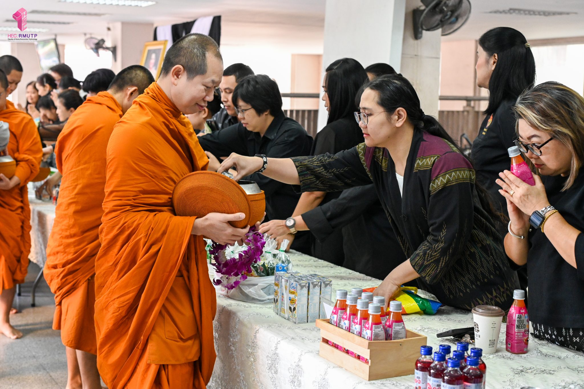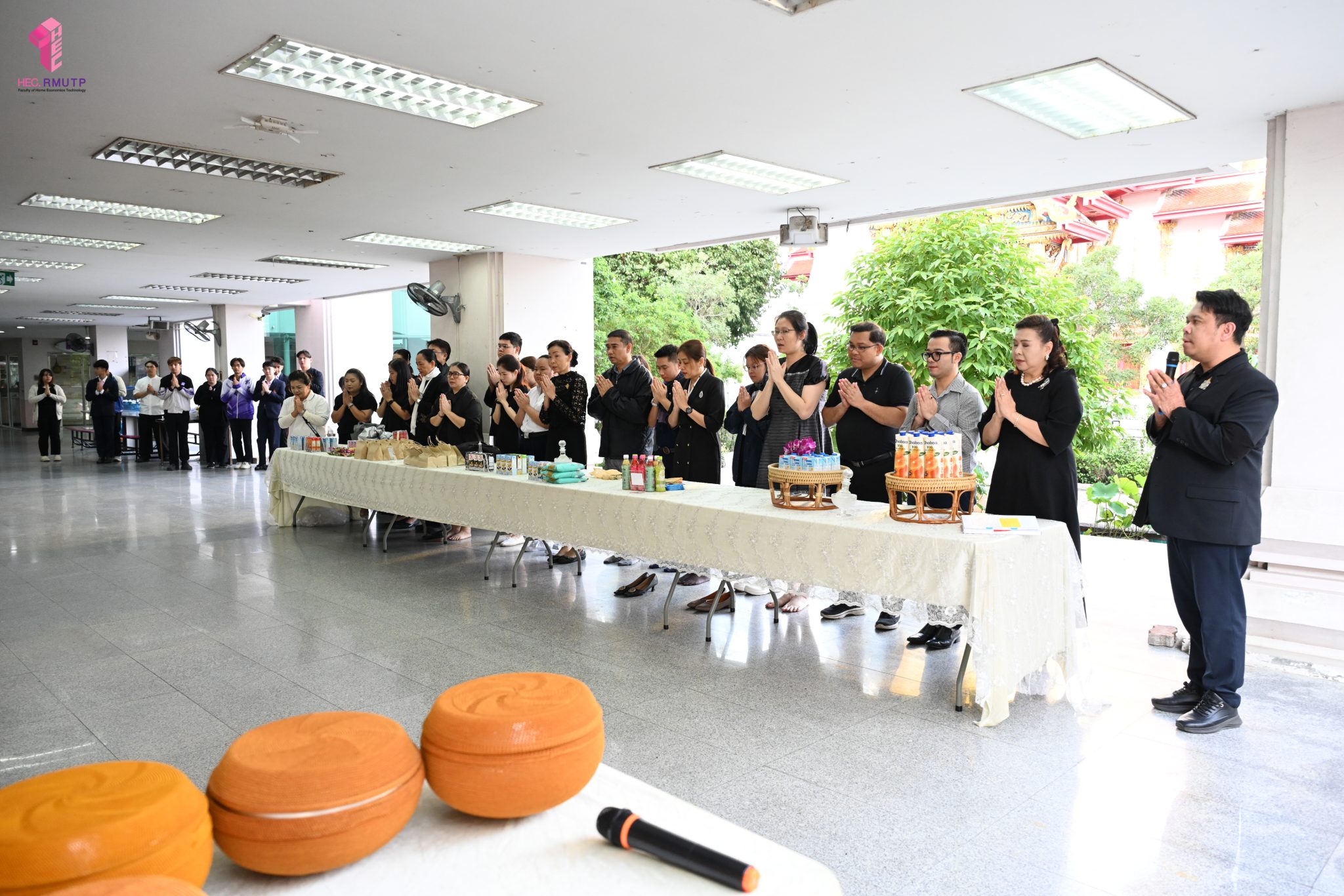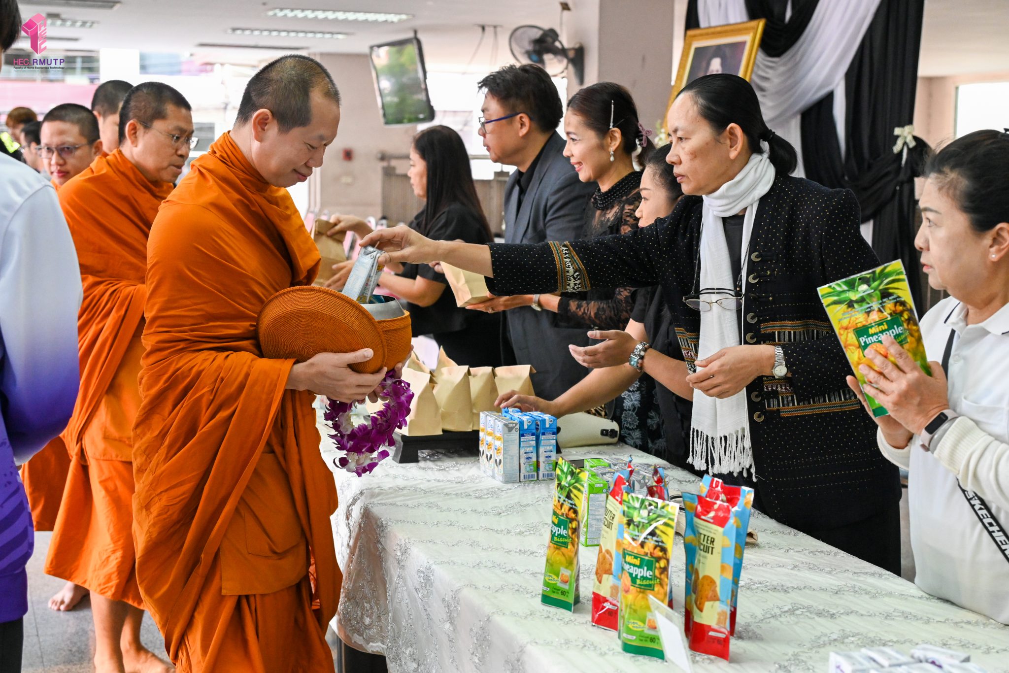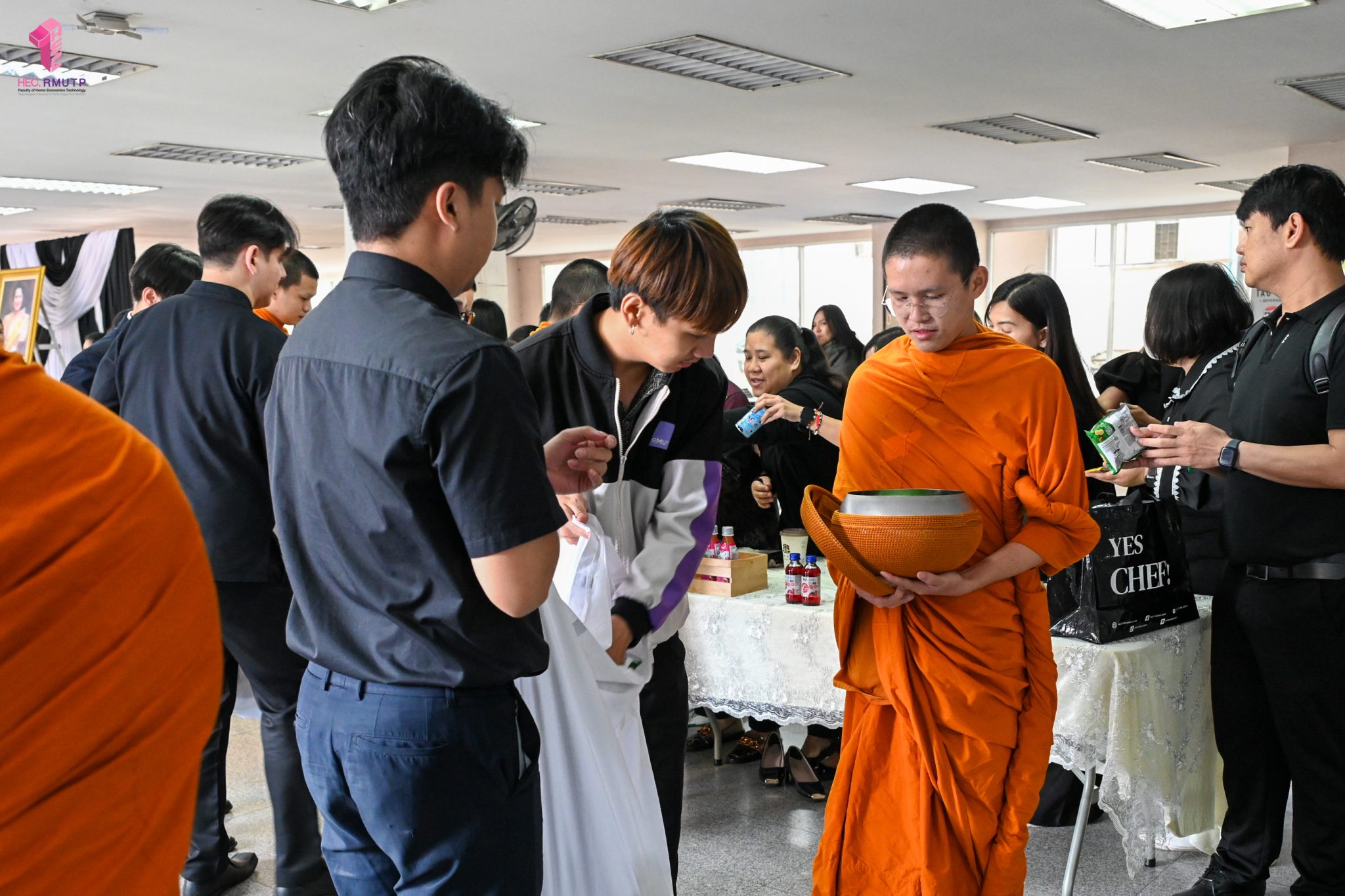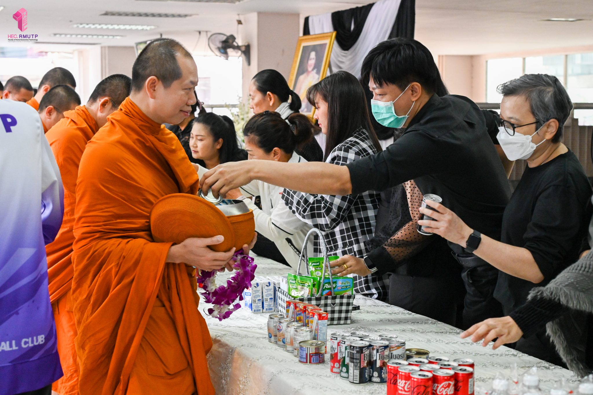งานศิลปวัฒนธรรม ฝ่ายกิจการนักศึกษา คณะเทคโนโลยีคหกรรมศาสตร์ จัดกิจกรรม “โครงการโชติเวชศุกร์กุศล เส้นทางบุญ เสริมสร้างคุณธรรม จริยธรรม น้อมนำพระพุทธศาสนา” ครั้งที่ 1 ประจำภาคเรียนที่ 2 ปี 2568 เพื่อเป็นพระราชกุศล แด่สมเด็จพระนางเจ้าสิริกิติ์ พระบรมราชินีนาถ พระบรมราชชนนีพันปีหลวง เพื่อแสดงออกถึงความจงรักภักดีและสำนึกในพระมหากรุณาธิคุณอันหาที่สุดมิได้ กิจกรรมประกอบไปด้วย ถวายราชสักการะหน้าพระฉายาลักษณ์ และตักบาตรข้าวสารอาหารแห้ง โดยนิมนต์พระสงฆ์จากวัดเทวราชกุญชร วรวิหาร รับบิณฑบาต เมื่อวันที่ 28 พฤศจิกายน 2568 ณ ลานอเนกประสงค์ ชั้น 1 อาคารเรือนปัญญา คณะเทคโนโลยีคหกรรมศาสตร์ ในการนี้ อาจารย์ปิยะธิดา สีหะวัฒนกุล ที่ปรึกษาคณบดี พร้อมด้วย ผศ.ดร.เชาวลิต อุปฐาก รองคณบดีฝ่ายกิจการนักศึกษา ผู้บริหาร คณาจารย์ บุคลากร และนักศึกษาคณะเทคโนโลยีคหกรรมศาสตร์ เข้าร่วมกิจกรรม