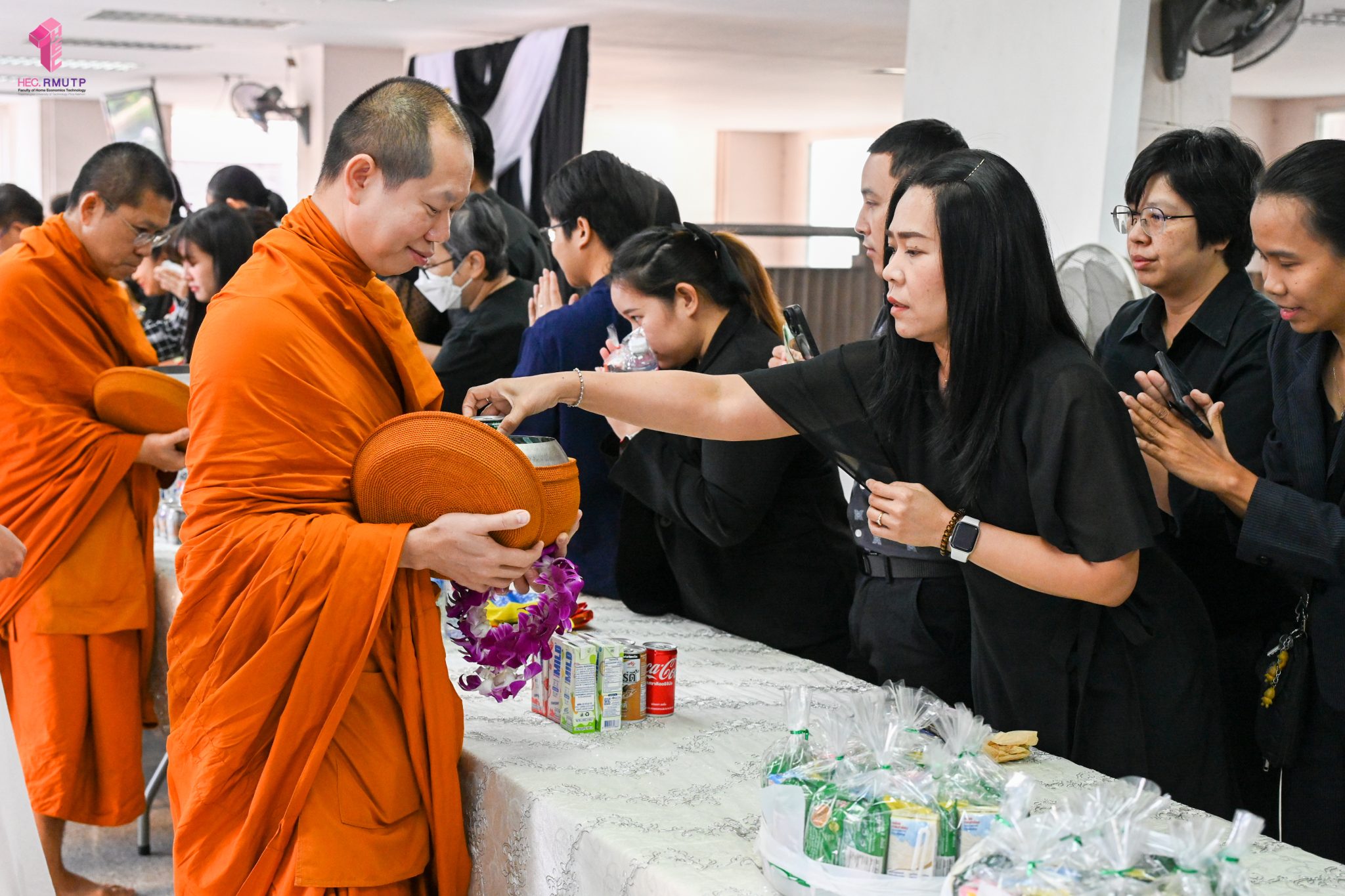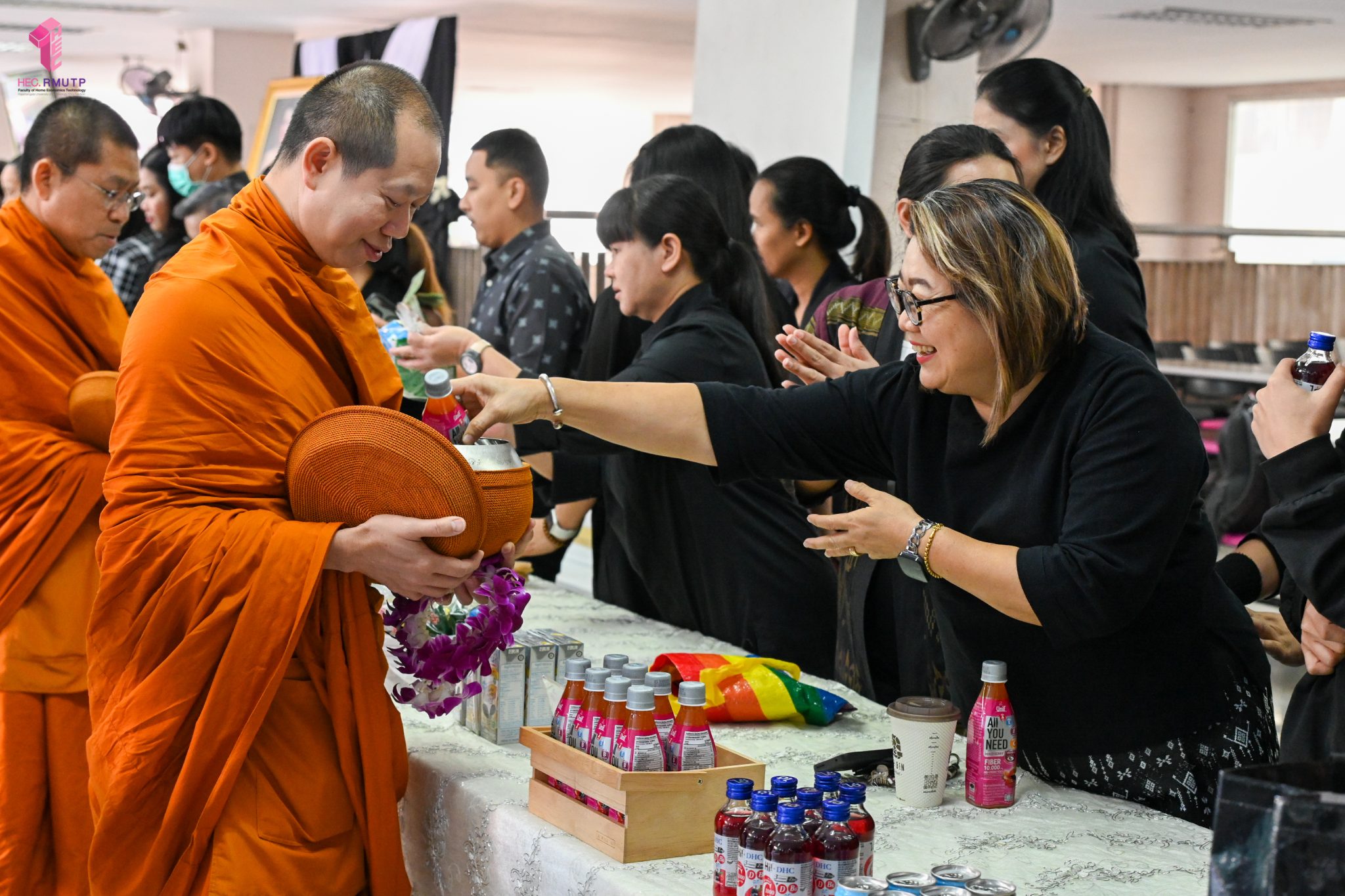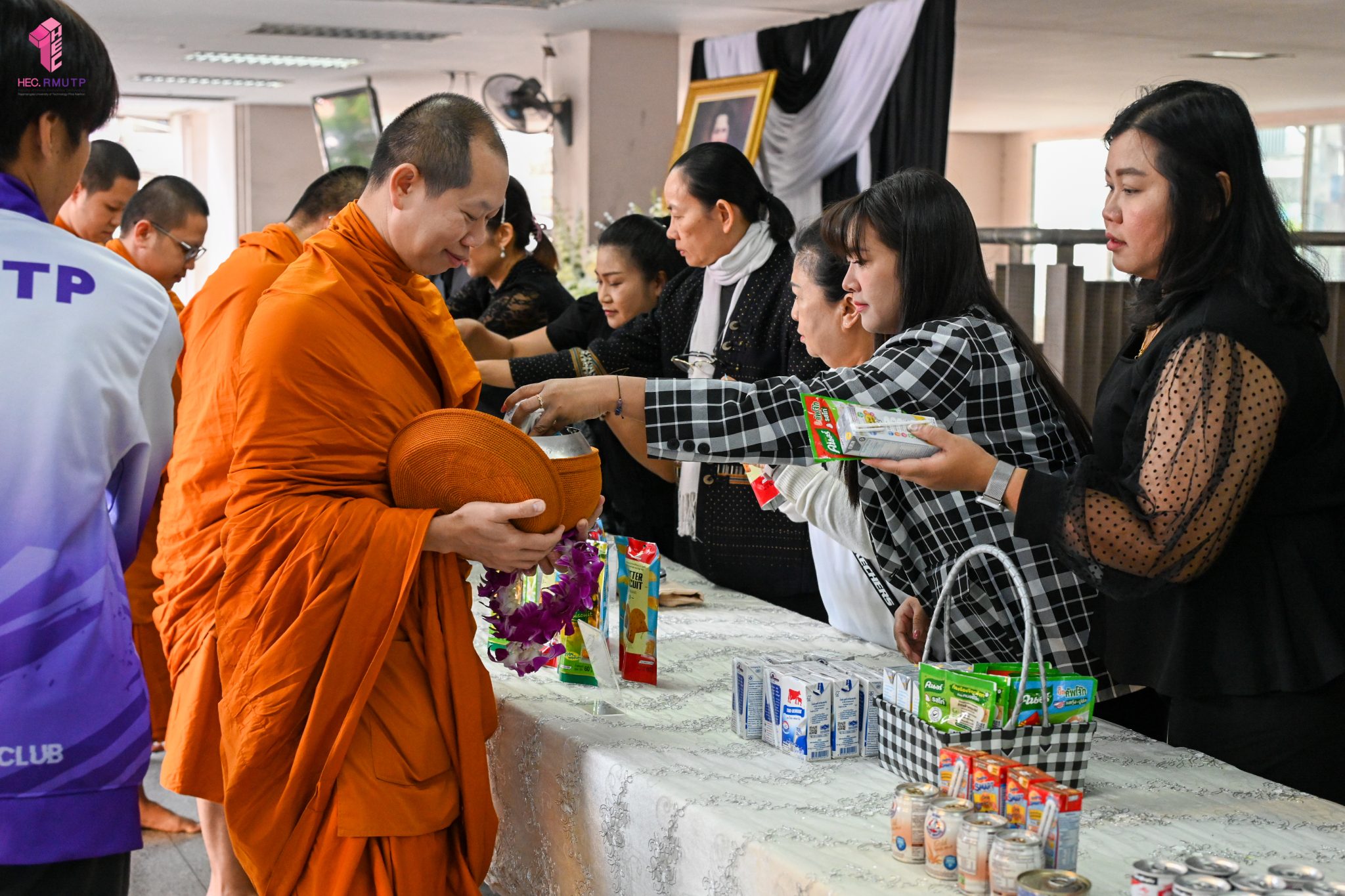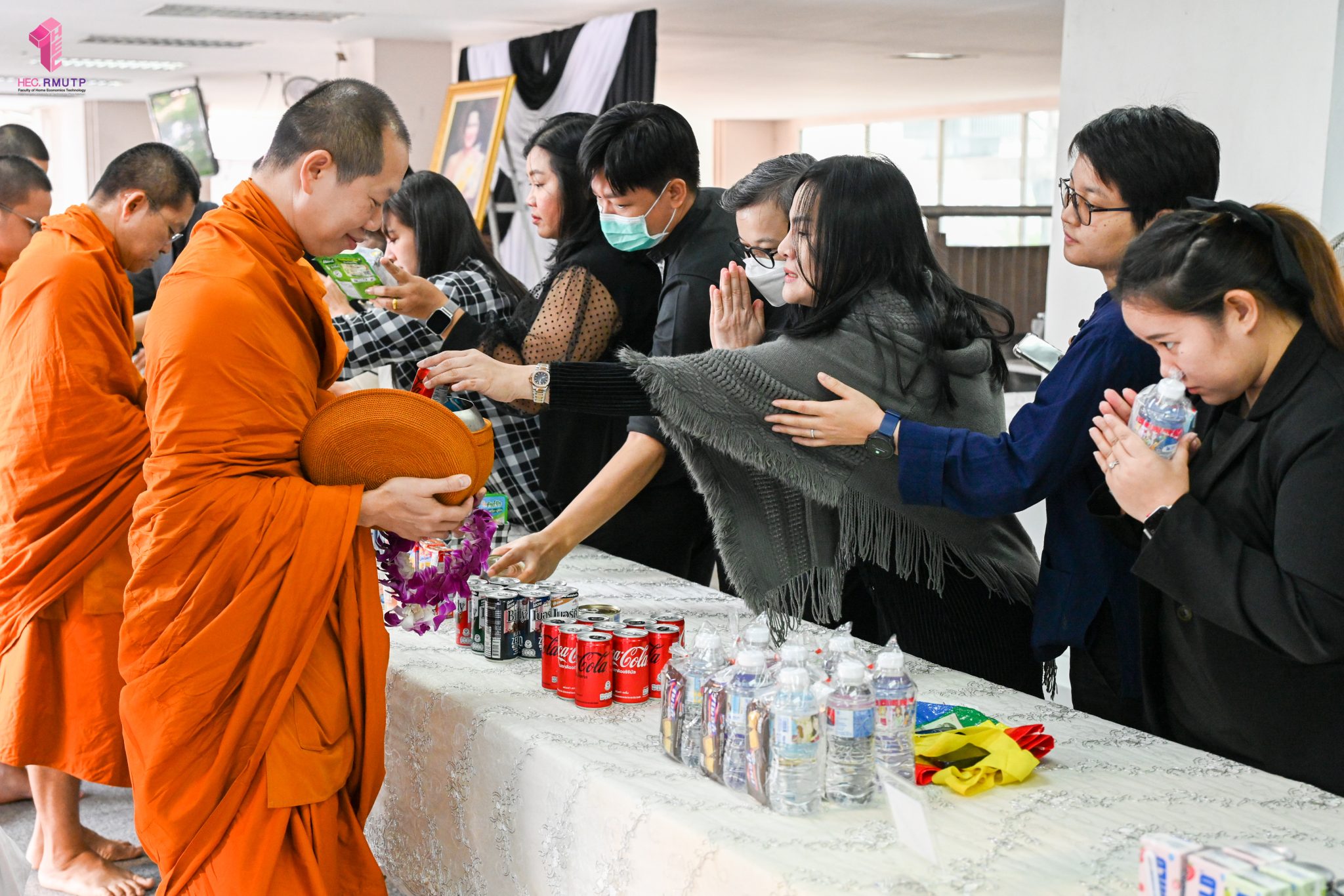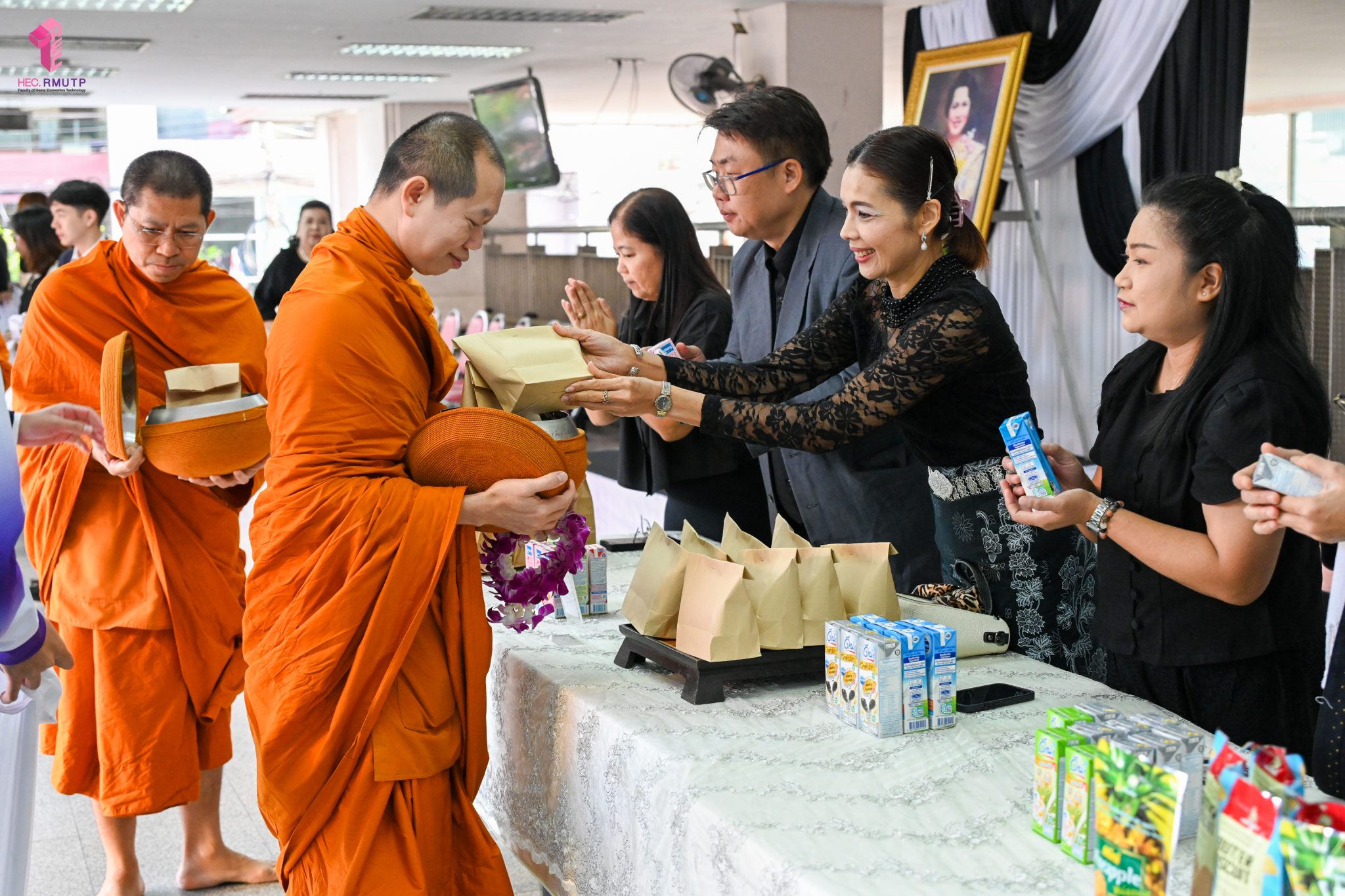 งานศิลปวัฒนธรรม ฝ่ายกิจการนักศึกษา คณะเทคโนโลยีคหกรรมศาสตร์ จัดกิจกรรม “โครงการโชติเวชศุกร์กุศล เส้นทางบุญ เสริมสร้างคุณธรรม จริยธรรม น้อมนำพระพุทธศาสนา” ครั้งที่ 1 ประจำภาคเรียนที่ 2 ปี 2568 เพื่อเป็นพระราชกุศล แด่สมเด็จพระนางเจ้าสิริกิติ์ พระบรมราชินีนาถ พระบรมราชชนนีพันปีหลวง เพื่อแสดงออกถึงความจงรักภักดีและสำนึกในพระมหากรุณาธิคุณอันหาที่สุดมิได้ กิจกรรมประกอบไปด้วย ถวายราชสักการะหน้าพระฉายาลักษณ์ และตักบาตรข้าวสารอาหารแห้ง โดยนิมนต์พระสงฆ์จากวัดเทวราชกุญชร วรวิหาร รับบิณฑบาต เมื่อวันที่ 28 พฤศจิกายน 2568 ณ ลานอเนกประสงค์ ชั้น 1 อาคารเรือนปัญญา คณะเทคโนโลยีคหกรรมศาสตร์ ในการนี้ อาจารย์ปิยะธิดา สีหะวัฒนกุล ที่ปรึกษาคณบดี พร้อมด้วย ผศ.ดร.เชาวลิต อุปฐาก รองคณบดีฝ่ายกิจการนักศึกษา ผู้บริหาร คณาจารย์ บุคลากร และนักศึกษาคณะเทคโนโลยีคหกรรมศาสตร์ เข้าร่วมกิจกรรม