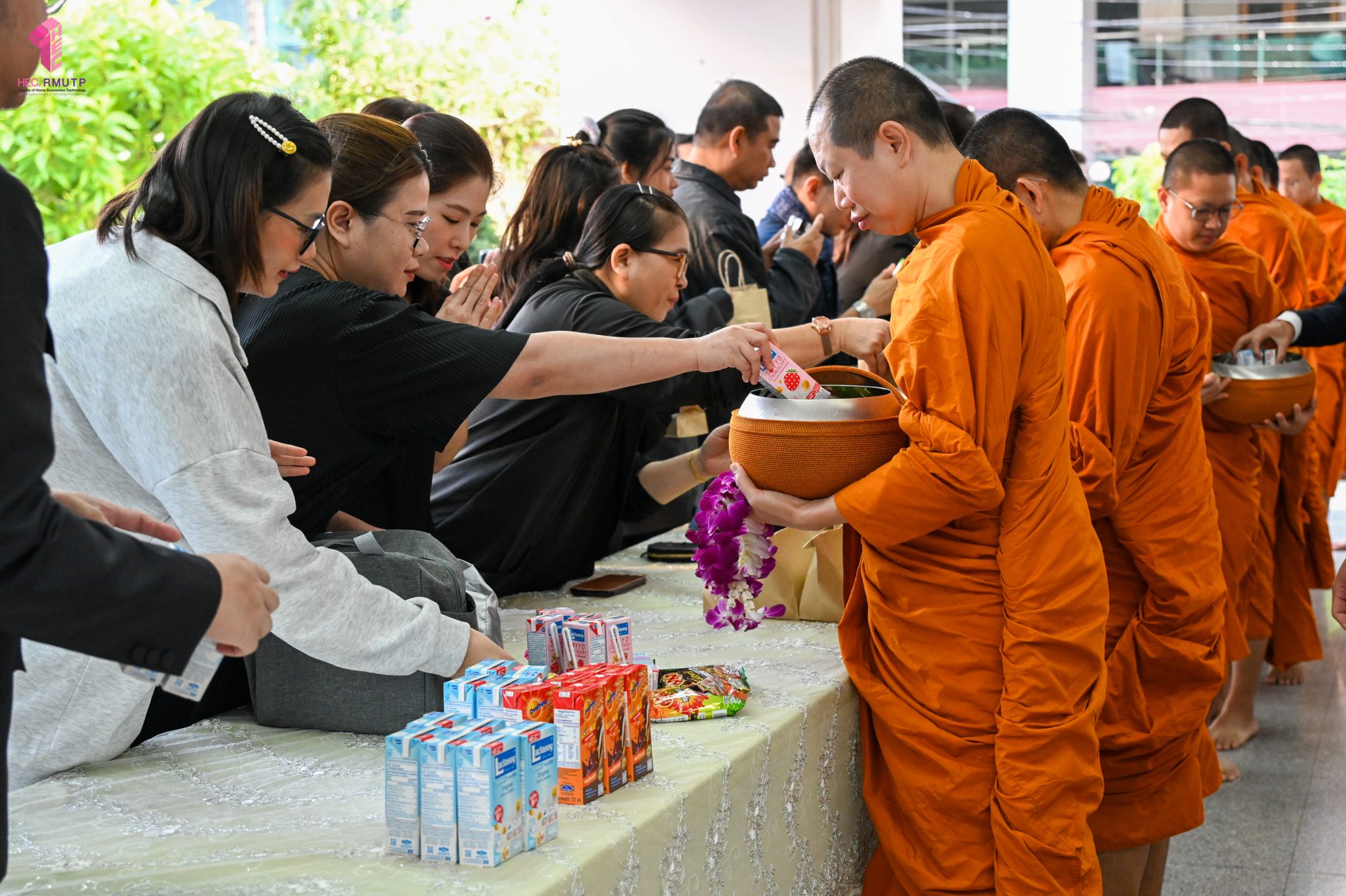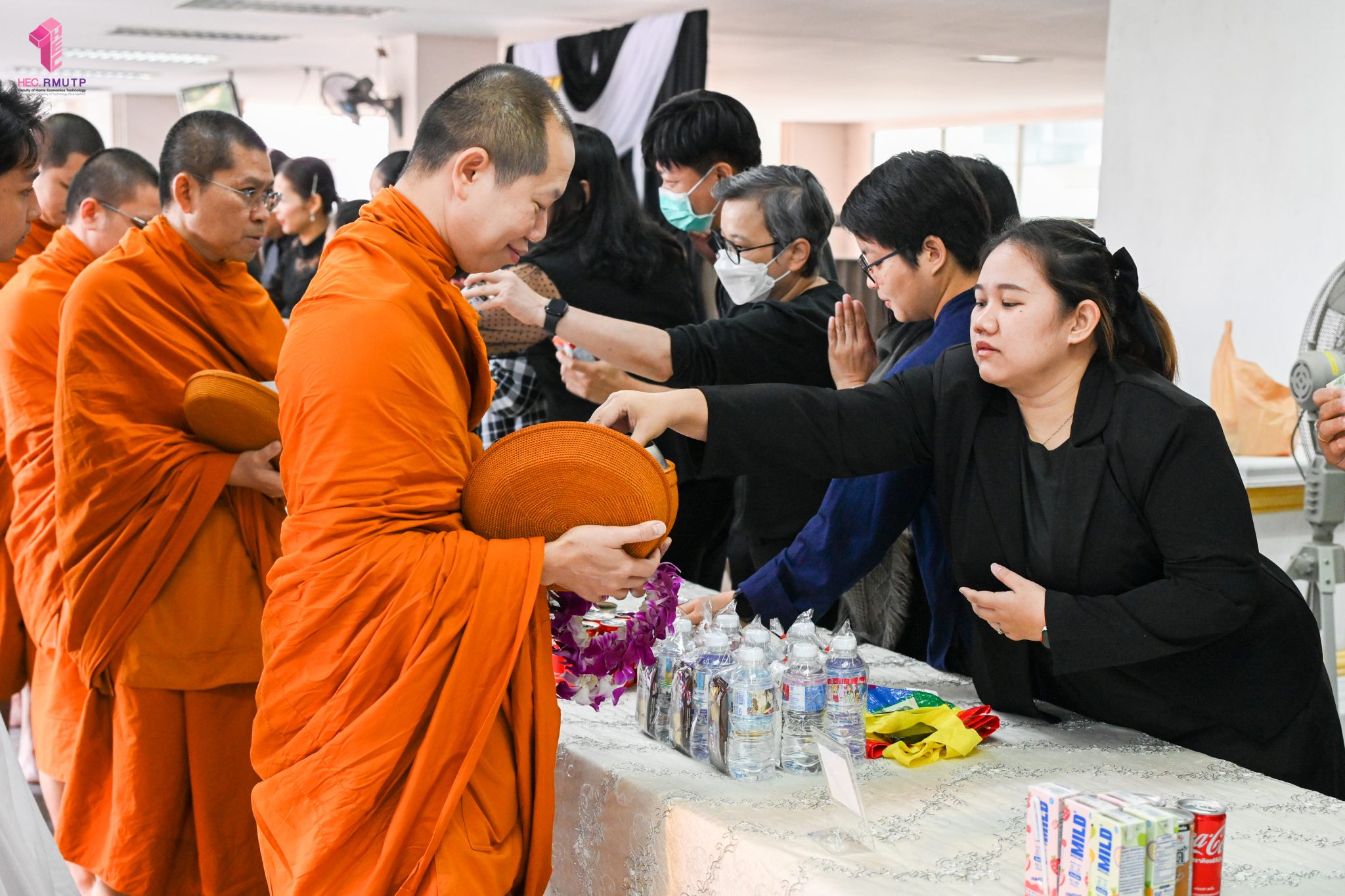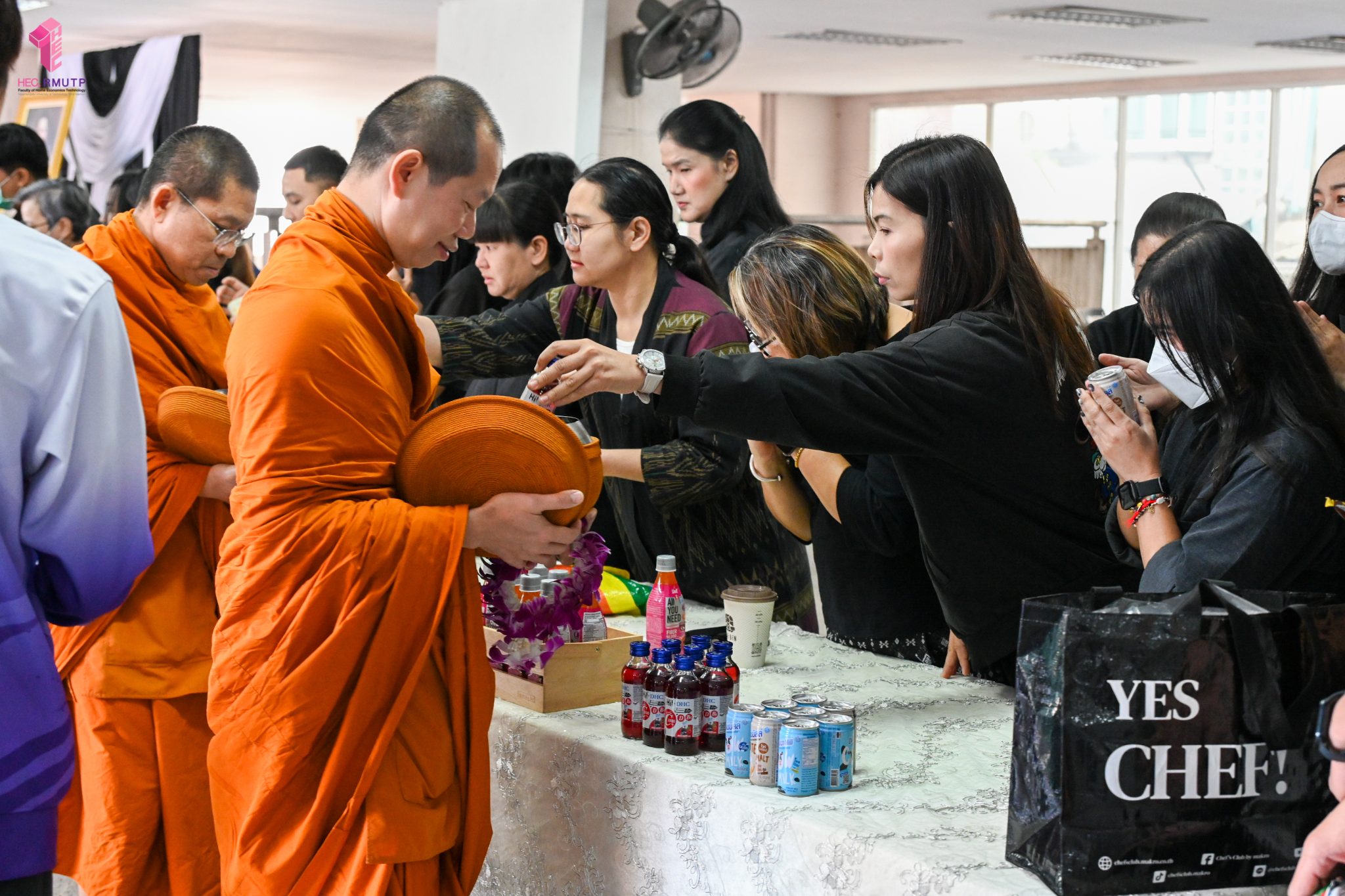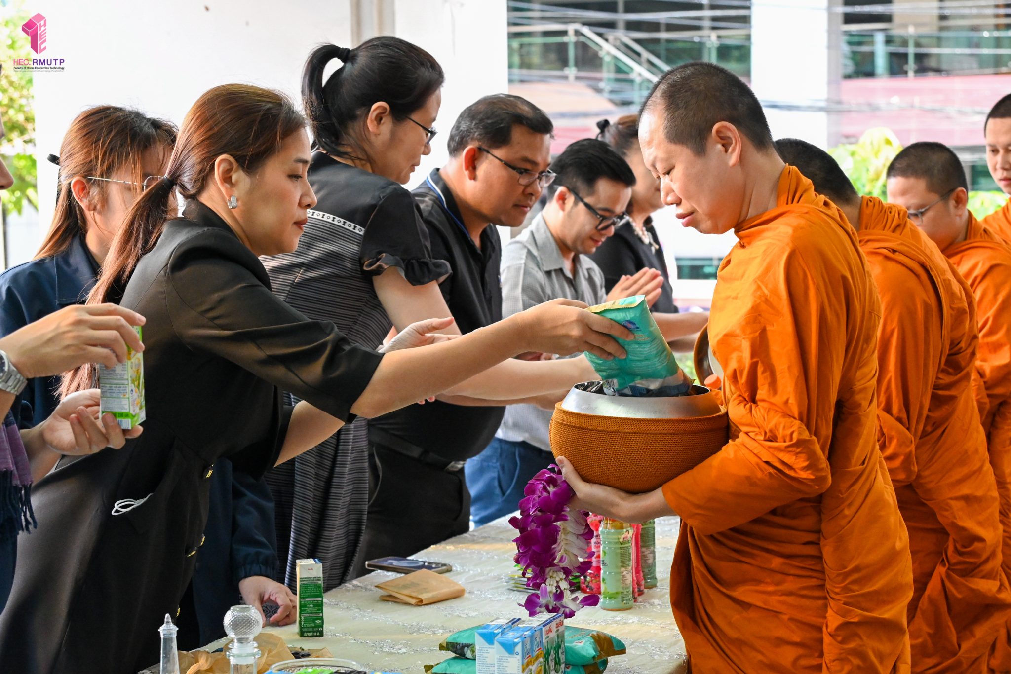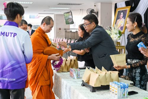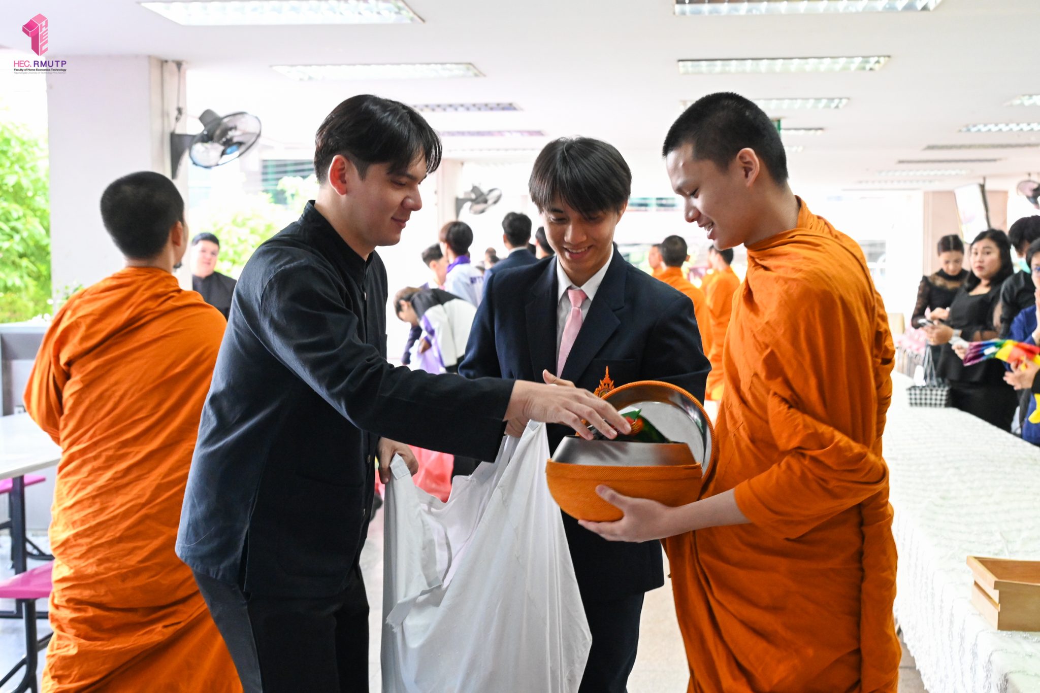 งานศิลปวัฒนธรรม ฝ่ายกิจการนักศึกษา คณะเทคโนโลยีคหกรรมศาสตร์ จัดกิจกรรม “โครงการโชติเวชศุกร์กุศล เส้นทางบุญ เสริมสร้างคุณธรรม จริยธรรม น้อมนำพระพุทธศาสนา” ครั้งที่ 1 ประจำภาคเรียนที่ 2 ปี 2568 เพื่อเป็นพระราชกุศล แด่สมเด็จพระนางเจ้าสิริกิติ์ พระบรมราชินีนาถ พระบรมราชชนนีพันปีหลวง เพื่อแสดงออกถึงความจงรักภักดีและสำนึกในพระมหากรุณาธิคุณอันหาที่สุดมิได้ กิจกรรมประกอบไปด้วย ถวายราชสักการะหน้าพระฉายาลักษณ์ และตักบาตรข้าวสารอาหารแห้ง โดยนิมนต์พระสงฆ์จากวัดเทวราชกุญชร วรวิหาร รับบิณฑบาต เมื่อวันที่ 28 พฤศจิกายน 2568 ณ ลานอเนกประสงค์ ชั้น 1 อาคารเรือนปัญญา คณะเทคโนโลยีคหกรรมศาสตร์ ในการนี้ อาจารย์ปิยะธิดา สีหะวัฒนกุล ที่ปรึกษาคณบดี พร้อมด้วย ผศ.ดร.เชาวลิต อุปฐาก รองคณบดีฝ่ายกิจการนักศึกษา ผู้บริหาร คณาจารย์ บุคลากร และนักศึกษาคณะเทคโนโลยีคหกรรมศาสตร์ เข้าร่วมกิจกรรม