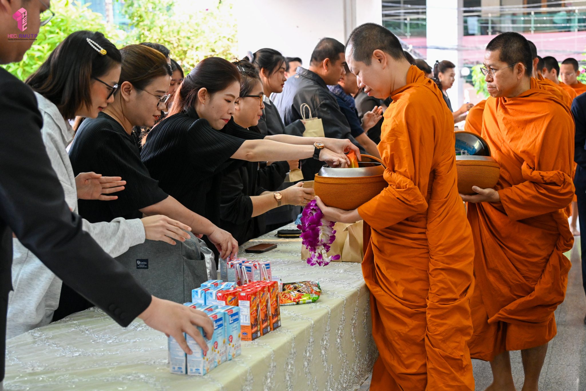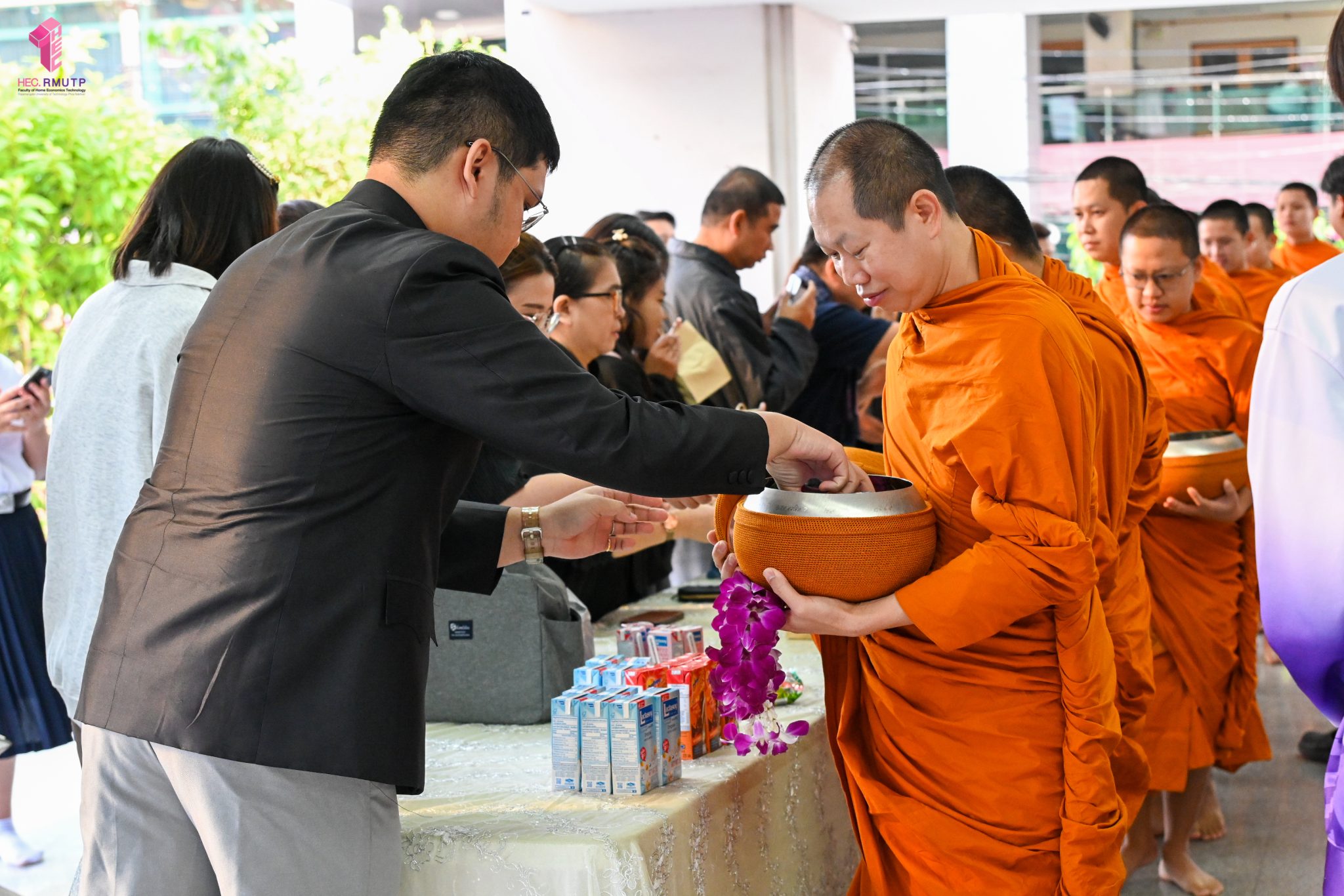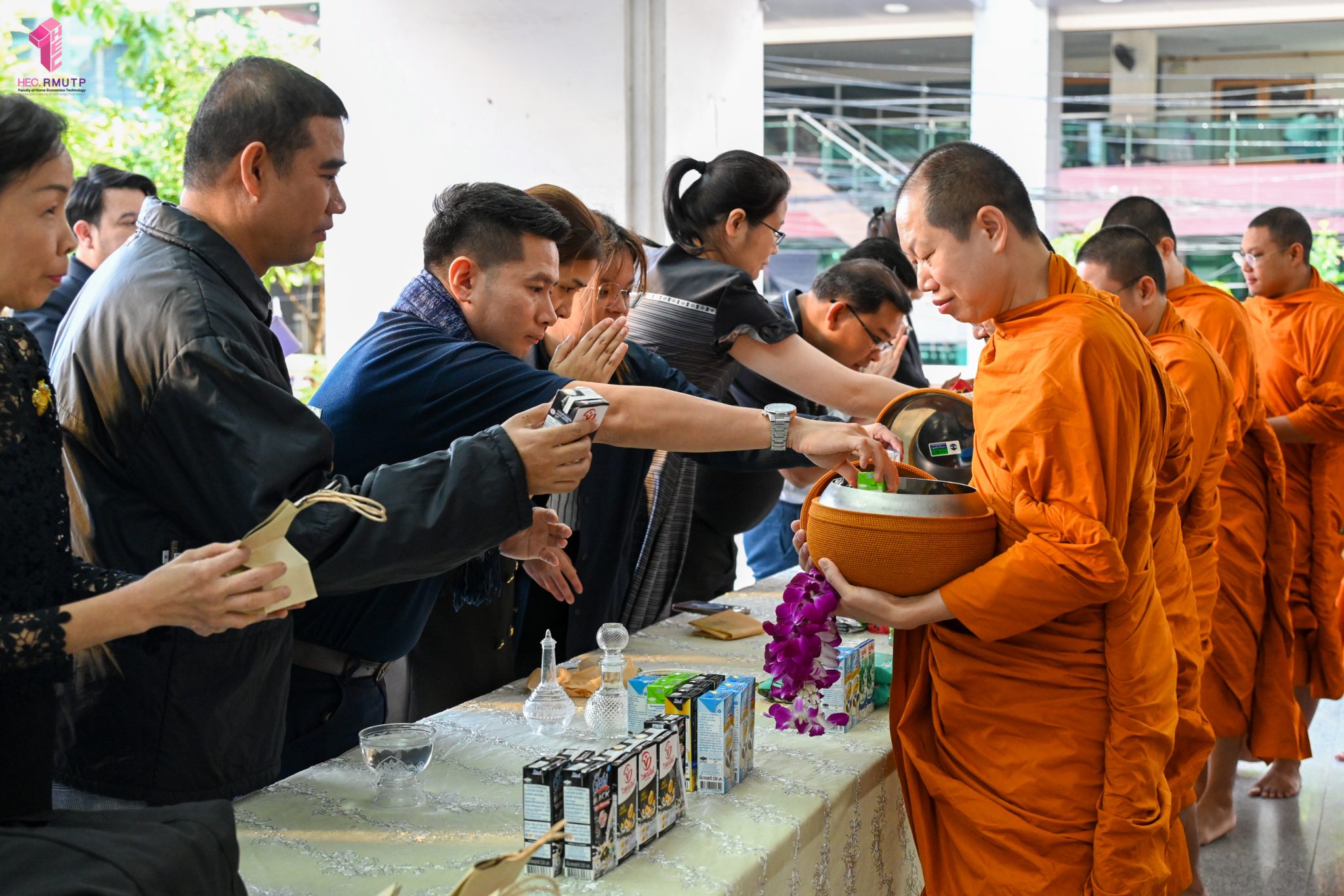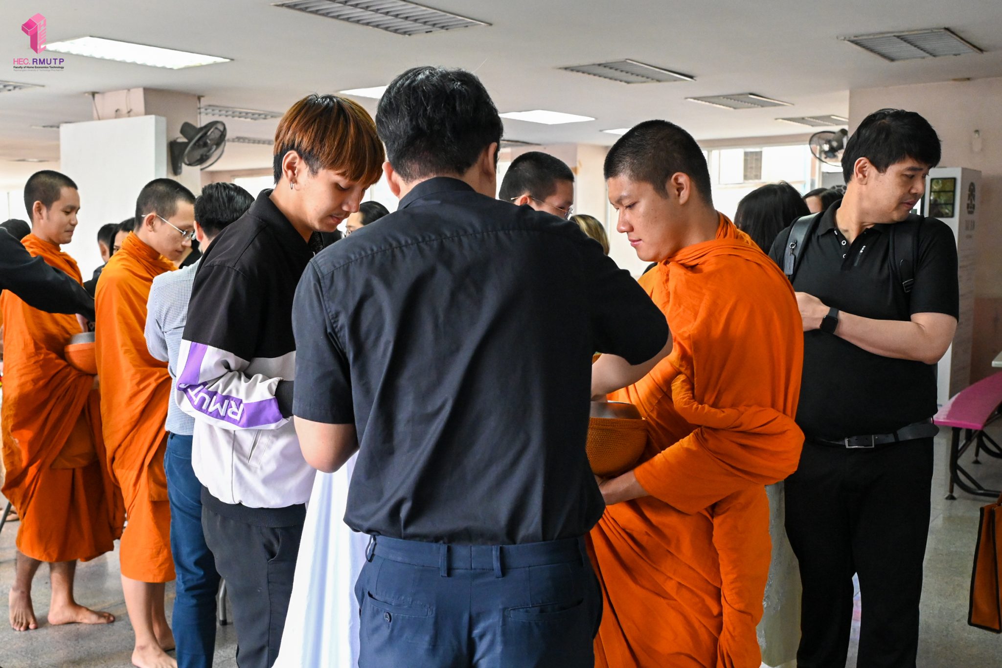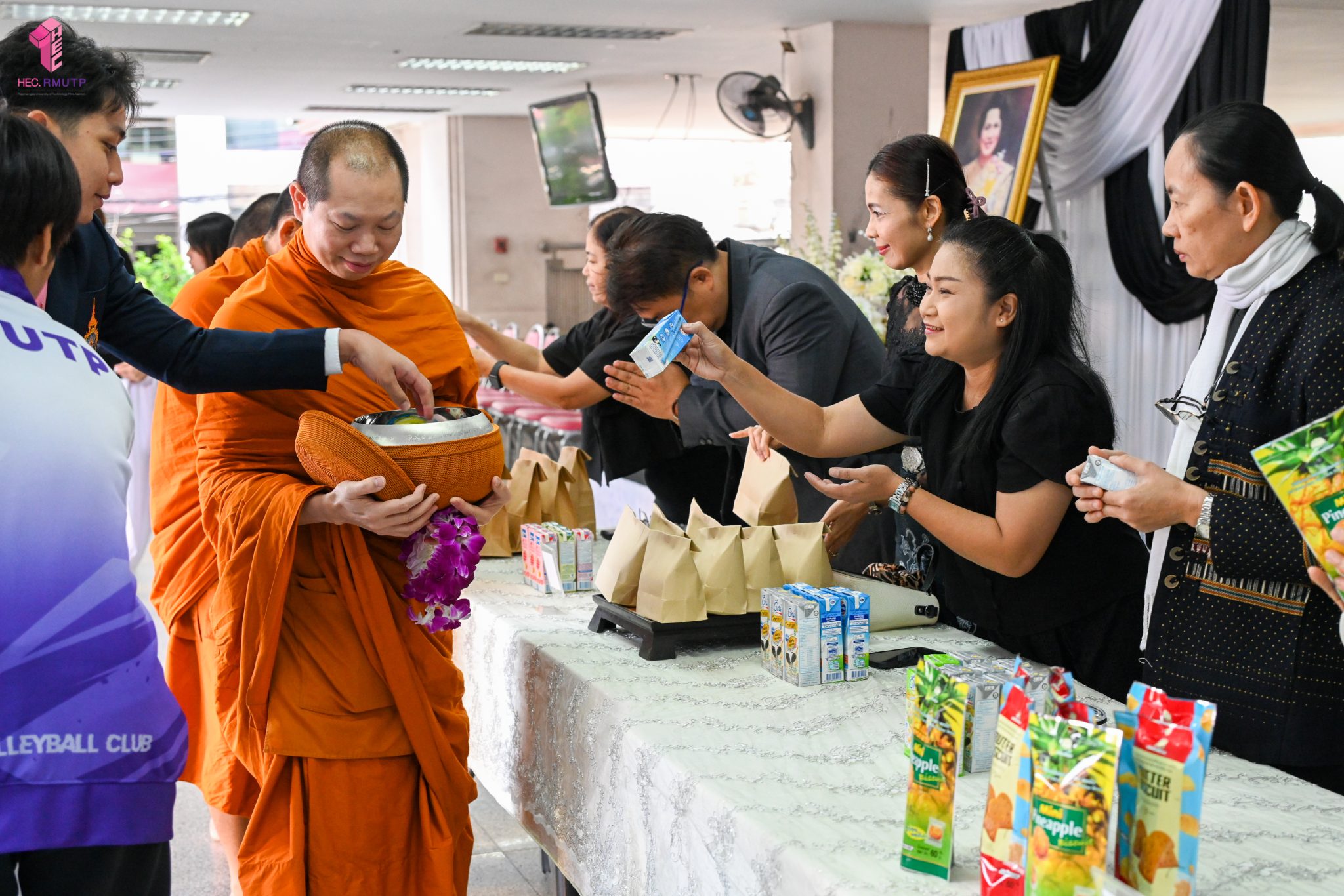 งานศิลปวัฒนธรรม ฝ่ายกิจการนักศึกษา คณะเทคโนโลยีคหกรรมศาสตร์ จัดกิจกรรม “โครงการโชติเวชศุกร์กุศล เส้นทางบุญ เสริมสร้างคุณธรรม จริยธรรม น้อมนำพระพุทธศาสนา” ครั้งที่ 1 ประจำภาคเรียนที่ 2 ปี 2568 เพื่อเป็นพระราชกุศล แด่สมเด็จพระนางเจ้าสิริกิติ์ พระบรมราชินีนาถ พระบรมราชชนนีพันปีหลวง เพื่อแสดงออกถึงความจงรักภักดีและสำนึกในพระมหากรุณาธิคุณอันหาที่สุดมิได้ กิจกรรมประกอบไปด้วย ถวายราชสักการะหน้าพระฉายาลักษณ์ และตักบาตรข้าวสารอาหารแห้ง โดยนิมนต์พระสงฆ์จากวัดเทวราชกุญชร วรวิหาร รับบิณฑบาต เมื่อวันที่ 28 พฤศจิกายน 2568 ณ ลานอเนกประสงค์ ชั้น 1 อาคารเรือนปัญญา คณะเทคโนโลยีคหกรรมศาสตร์ ในการนี้ อาจารย์ปิยะธิดา สีหะวัฒนกุล ที่ปรึกษาคณบดี พร้อมด้วย ผศ.ดร.เชาวลิต อุปฐาก รองคณบดีฝ่ายกิจการนักศึกษา ผู้บริหาร คณาจารย์ บุคลากร และนักศึกษาคณะเทคโนโลยีคหกรรมศาสตร์ เข้าร่วมกิจกรรม