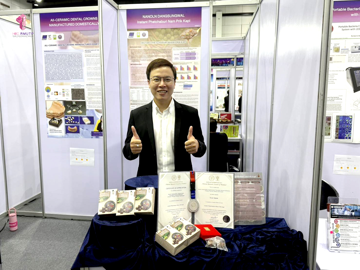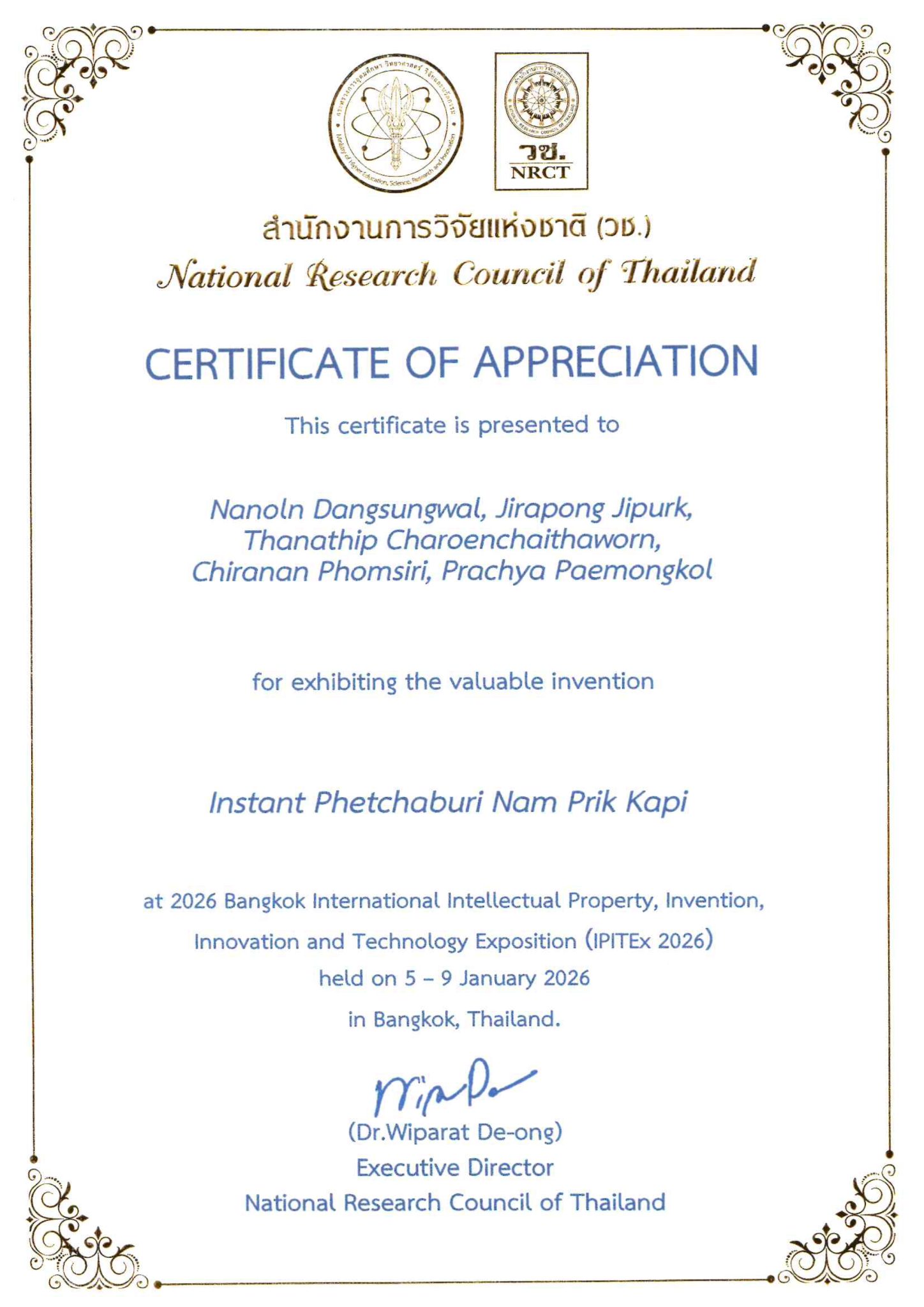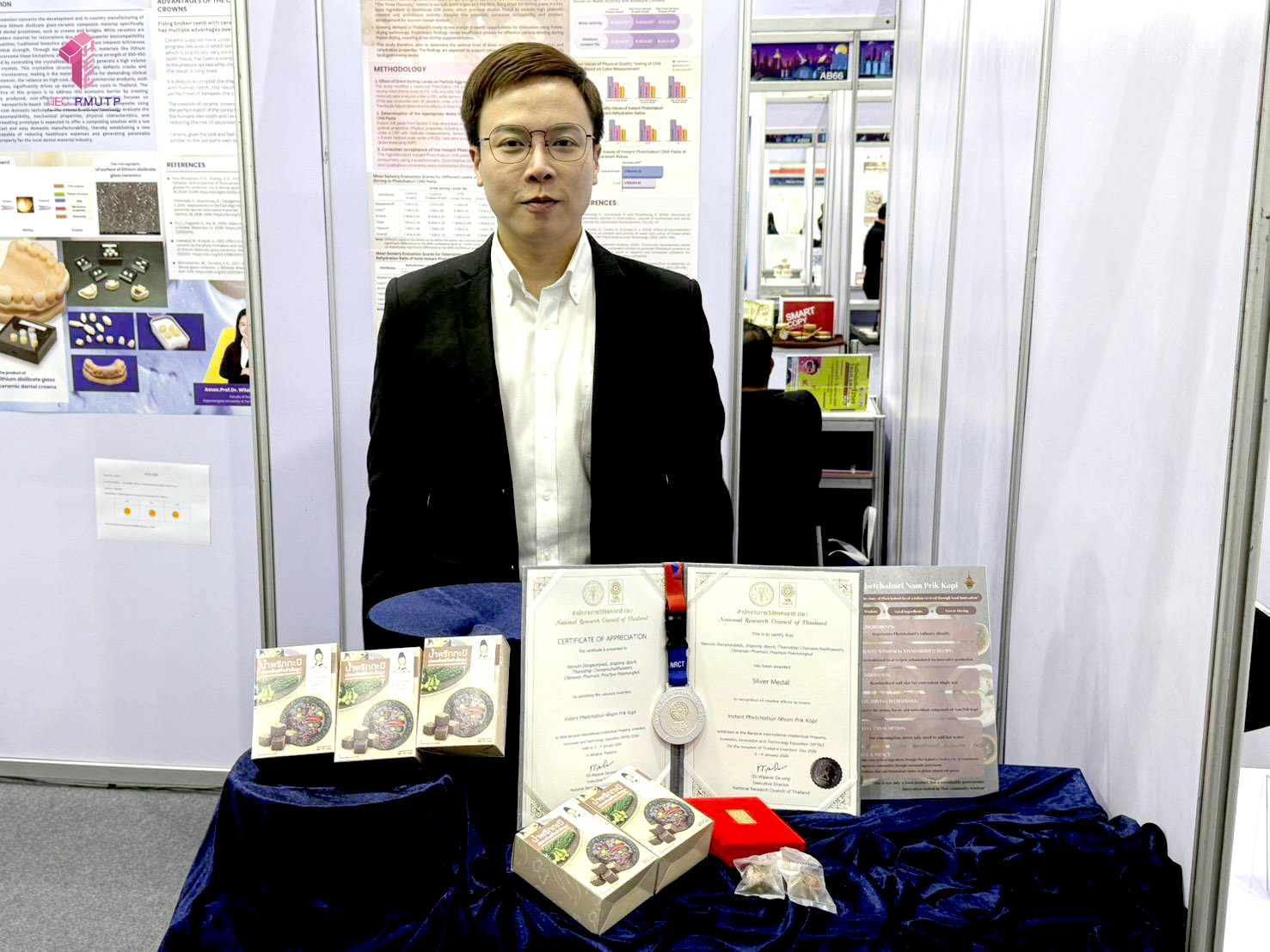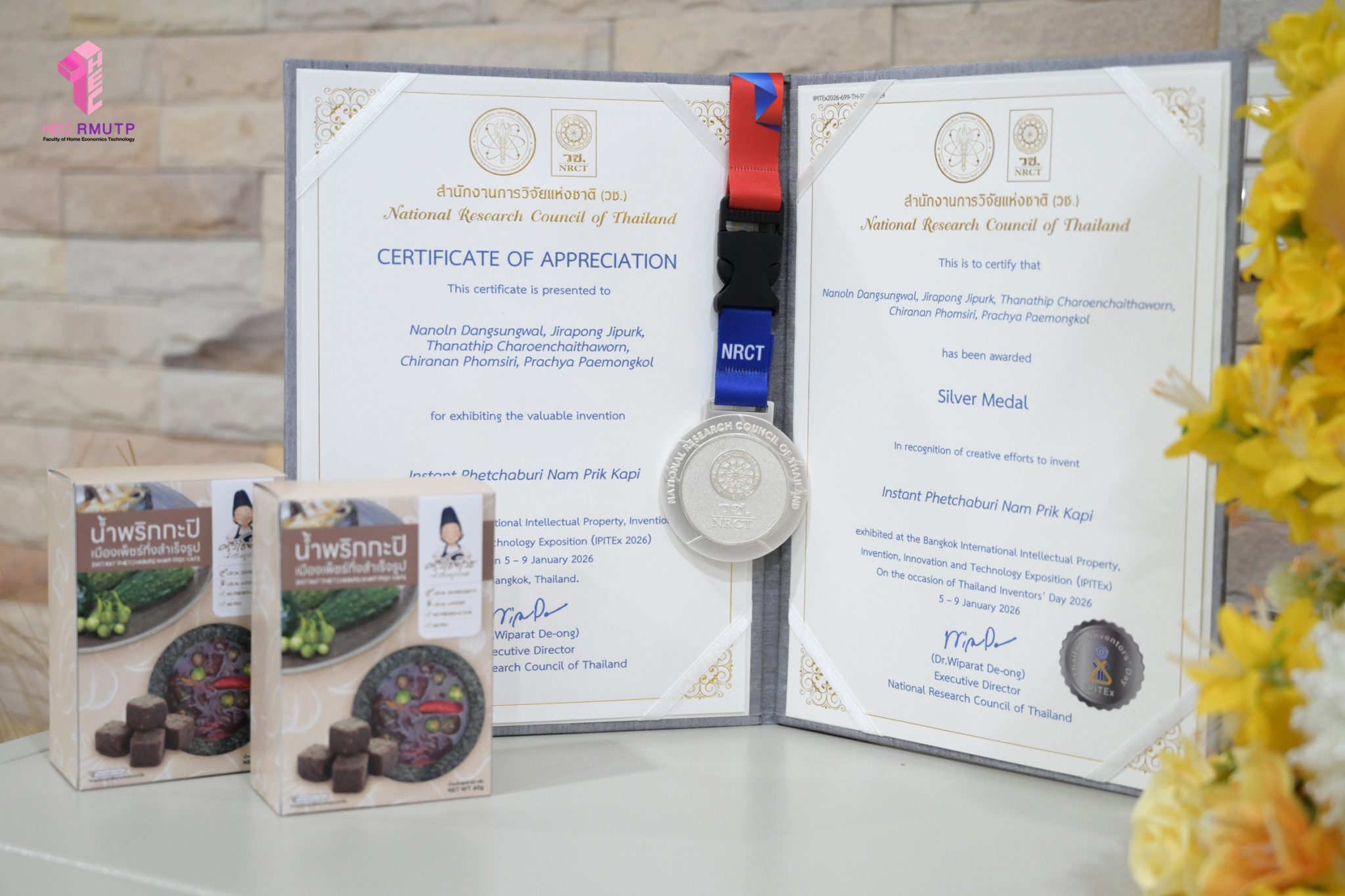 คณะเทคโนโลยีคหกรรมศาสตร์ มหาวิทยาลัยเทคโนโลยีราชมงคลพระนคร ขอแสดงความยินดีกับ ผู้ช่วยศาสตราจารย์ ดร.ณนนท์ แดงสังวาลย์ และคณะ รับรางวัลเหรียญเงิน (Silver Medal) จากการส่งผลงานผลงานเรื่อง “Instant Phetchaburi Nam Prik Kapi” เข้าร่วมประกวดในมหกรรมสิ่งประดิษฐ์และนวัตกรรมนานาชาติ IPITEx 2026 ภายใต้งาน “วันนักประดิษฐ์” ประจำปี 2569 (Thailand Inventors’ Day 2026) เมื่อวันที่ 9 มกราคม 2569 ณ EVENT HALL 102–104 ศูนย์นิทรรศการและการประชุมไบเทค บางนา กรุงเทพมหานคร