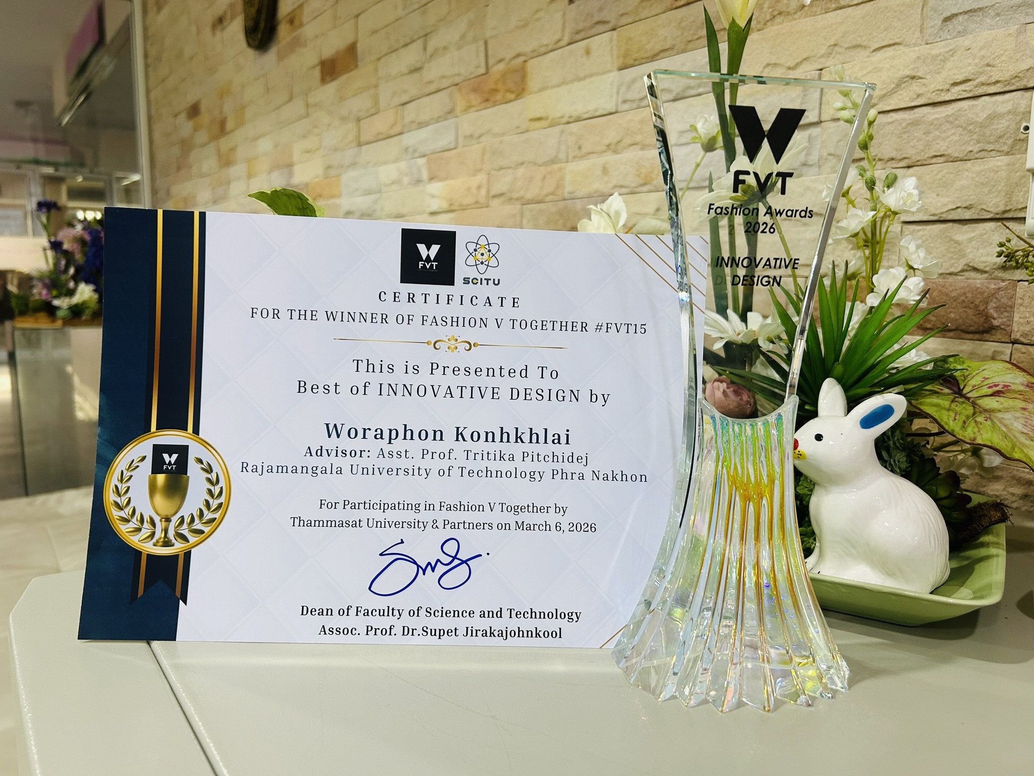 ขอแสดงความยินดีกับ นายณฐภณ นัดกระโทก นักศึกษารุ่น 67 ชั้นปีที่ 2 สาขาวิชาออกแบบแฟชั่นและการจัดการสินค้า คณะเทคโนโลยีคหกรรมศาสตร์ มหาวิทยาลัยเทคโนโลยีราชมงคลพระนคร ที่สามารถคว้ารางวัล ชนะเลิศด้าน Innovative Design (รางวัลนวัตกรรมการออกแบบ) จากเวทีการแสดงผลงานแฟชั่นของนักศึกษา รางวัลดังกล่าวมอบให้แก่ผลงานที่มีแนวคิดสร้างสรรค์ใหม่หรือมีนวัตกรรมโดดเด่น มีการพัฒนาเทคนิค รูปแบบ หรือกระบวนการออกแบบที่แตกต่างจากเดิม สะท้อนถึงความคิดก้าวหน้าและศักยภาพในการต่อยอดสู่การพัฒนาในอนาคต โดยผลงานชุดที่ได้รับรางวัลในครั้งนี้มีแนวคิดการออกแบบจาก “FUTURE NETWORK” ซึ่งสะท้อนมุมมองของเครือข่ายแห่งอนาคต การเชื่อมโยงของเทคโนโลยี โครงสร้าง และความสัมพันธ์ของผู้คนในโลกยุคใหม่ ผ่านรูปแบบการออกแบบที่ทันสมัยและมีเอกลักษณ์ เมื่อวันที่ 6 มีนาคม 2569 ณ อุทยานเรียนรู้ป๋วย 100 ปี มหาวิทยาลัยธรรมศาสตร์ ศูนย์รังสิต